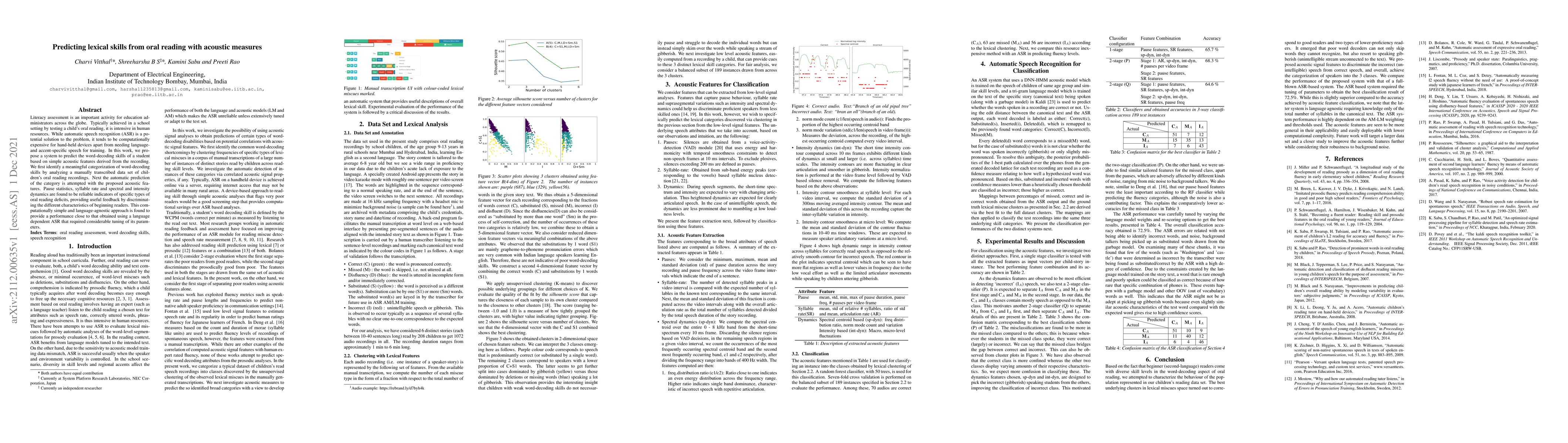 Literacy assessment is an important activity for education administrators across the globe. Typically achieved in a school setting by testing a child's oral reading, it is intensive in human resources. While automatic speech recognition (ASR) is a potential solution to the problem, it tends to be computationally expensive for hand-held devices apart from needing language and accent-specific speech for training. In this work, we propose a system to predict the word-decoding skills of a student based on simple acoustic features derived from the recording. We first identify a meaningful categorization of word-decoding skills by analyzing a manually transcribed data set of children's oral reading recordings. Next the automatic prediction of the category is attempted with the proposed acoustic features. Pause statistics, syllable rate and spectral and intensity dynamics are found to be reliable indicators of specific types of oral reading deficits, providing useful feedback by discriminating the different characteristics of beginning readers. This computationally simple and language-agnostic approach is found to provide a performance close to that obtained using a language dependent ASR that required considerable tuning of its parameters.
