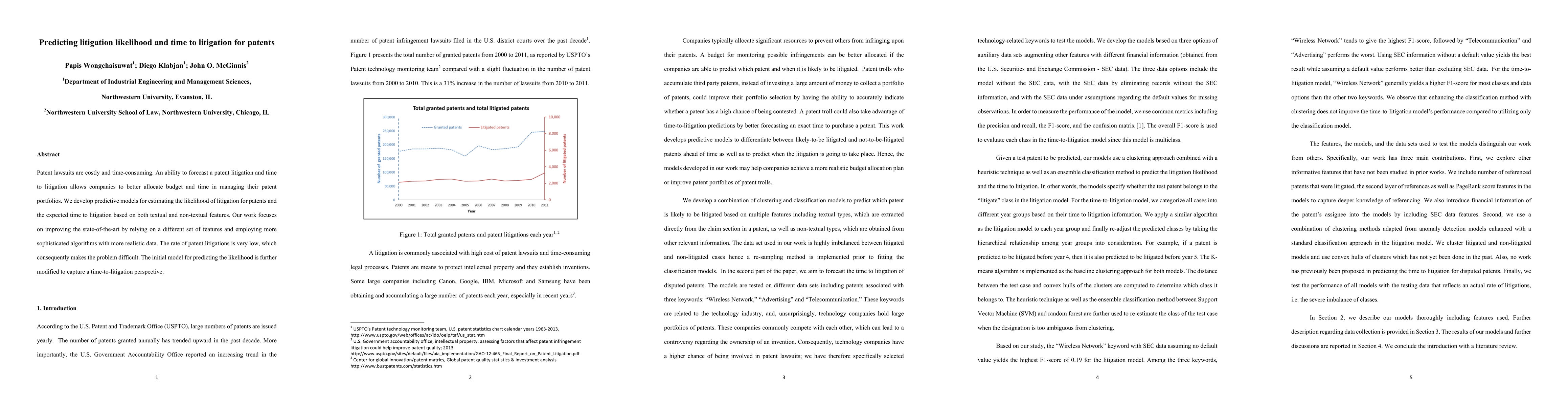 This paper develops predictive models to estimate the likelihood and time to patent litigation using a combination of textual and non-textual features. It aims to improve upon existing methods by incorporating a more sophisticated set of algorithms and realistic data, addressing the challenge of low litigation rates.