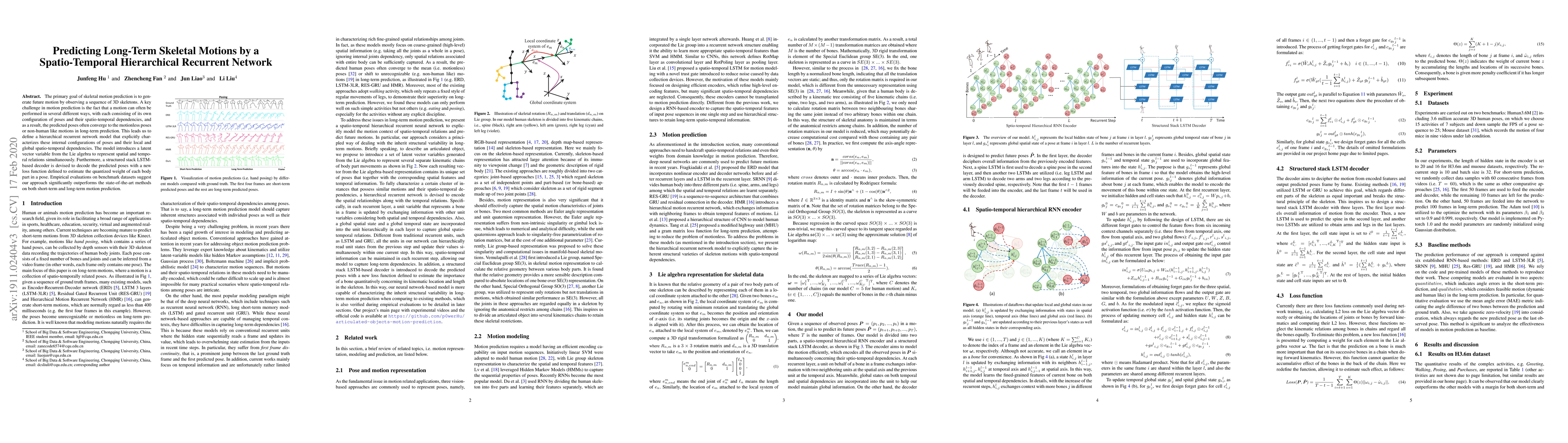 The primary goal of skeletal motion prediction is to generate future motion by observing a sequence of 3D skeletons. A key challenge in motion prediction is the fact that a motion can often be performed in several different ways, with each consisting of its own configuration of poses and their spatio-temporal dependencies, and as a result, the predicted poses often converge to the motionless poses or non-human like motions in long-term prediction. This leads us to define a hierarchical recurrent network model that explicitly characterizes these internal configurations of poses and their local and global spatio-temporal dependencies. The model introduces a latent vector variable from the Lie algebra to represent spatial and temporal relations simultaneously. Furthermore, a structured stack LSTM-based decoder is devised to decode the predicted poses with a new loss function defined to estimate the quantized weight of each body part in a pose. Empirical evaluations on benchmark datasets suggest our approach significantly outperforms the state-of-the-art methods on both short-term and long-term motion prediction.
