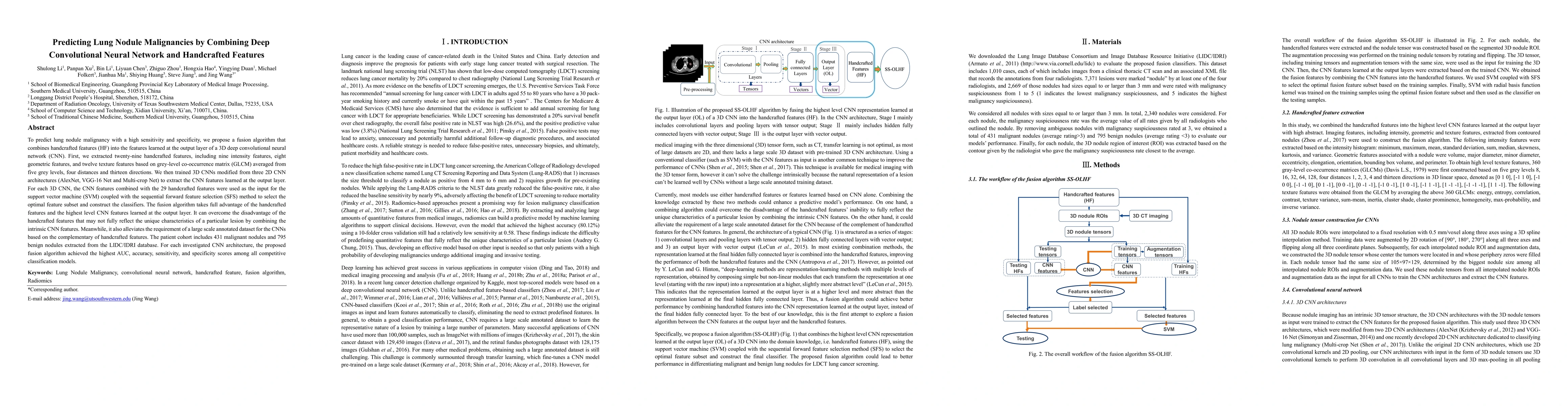 This research proposes a fusion algorithm combining handcrafted features with deep convolutional neural network (CNN) features to predict lung nodule malignancy, achieving higher AUC, accuracy, sensitivity, and specificity compared to other models. The algorithm leverages both handcrafted and CNN features to improve diagnostic performance while reducing the need for large annotated datasets.