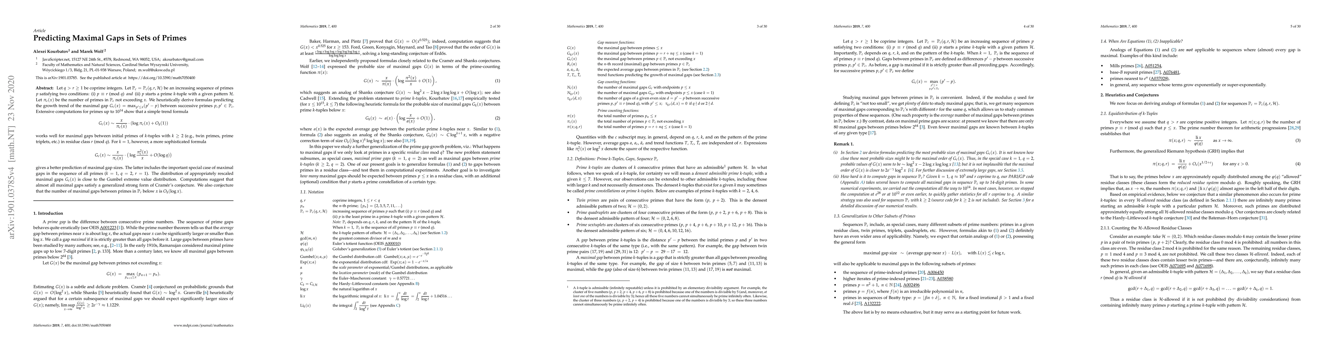 This paper develops heuristic formulas to predict maximal gaps between primes in specific sequences defined by congruence conditions and prime k-tuple patterns. For k ≥ 2, the formula $G_c(x) \sim {x\over\pi_c(x)}\cdot(\log \pi_c(x) + O_k(1))$ works well, while a more complex formula applies for k = 1, incorporating the sequence of all primes. The paper also suggests that the distribution of maximal gaps aligns with the Gumbel extreme value distribution.