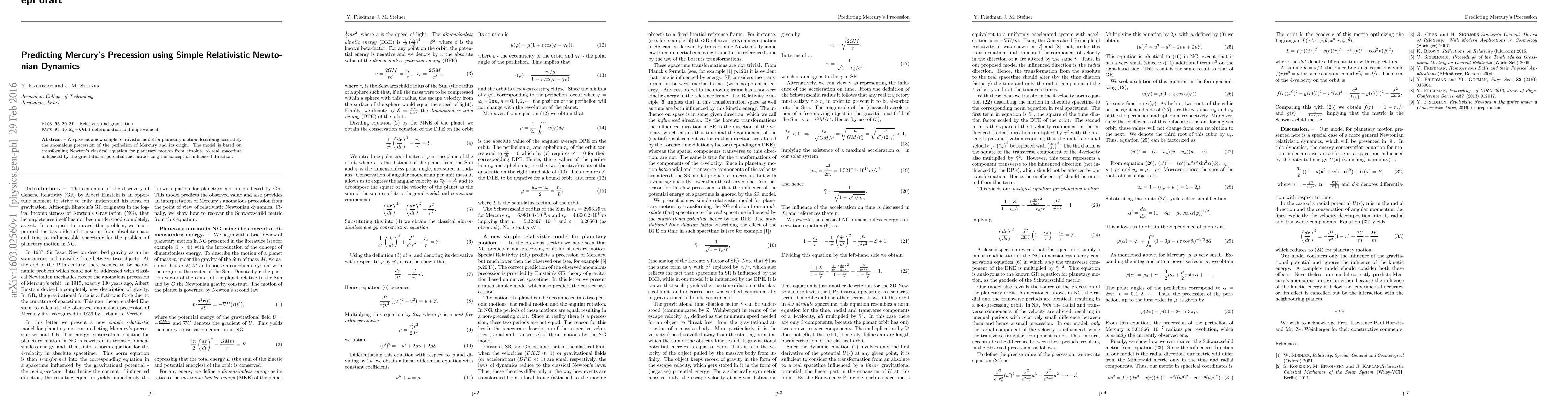 Summary: This paper introduces a novel relativistic model that accurately predicts Mercury's anomalous perihelion precession by transforming Newton's classical equations into a relativistic framework influenced by gravitational potential, incorporating the concept of influenced direction. The model provides a new perspective on Mercury's orbital dynamics.