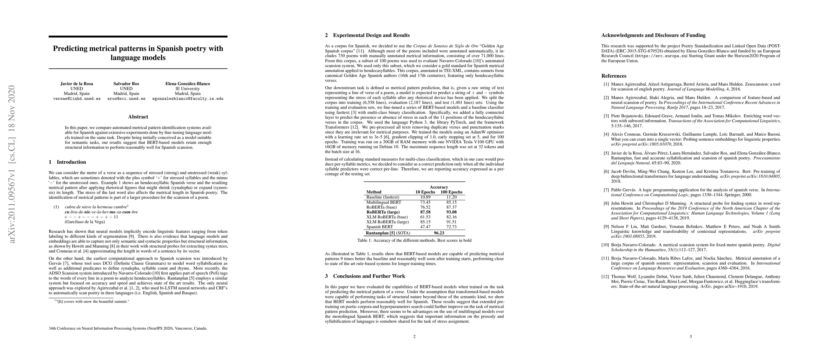 Summary: This study evaluates automated systems for identifying metrical patterns in Spanish poetry, demonstrating that fine-tuned BERT-based models, originally designed for semantic tasks, can achieve reasonable accuracy in Spanish scansion due to retained structural information.