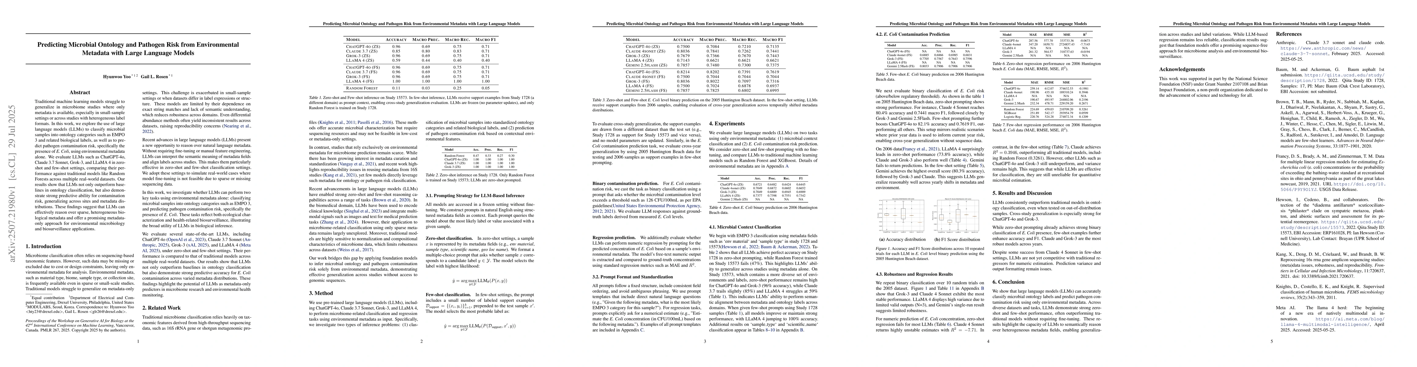 The paper explores using large language models (LLMs) like ChatGPT-4o, Claude 3.7 Sonnet, Grok-3, and LLaMA 4 to classify microbial samples into ontology categories and predict pathogen contamination risk, specifically E. Coli, using environmental metadata alone. The performance of LLMs is compared against traditional models like Random Forests across multiple datasets in zero-shot and few-shot settings.