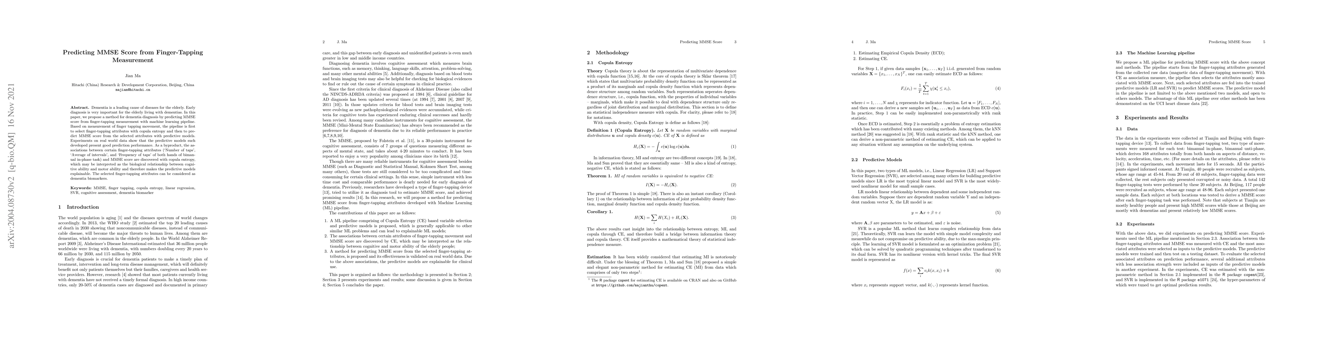 Dementia is a leading cause of diseases for the elderly. Early diagnosis is very important for the elderly living with dementias. In this paper, we propose a method for dementia diagnosis by predicting MMSE score from finger-tapping measurement with machine learning pipeline. Based on measurement of finger tapping movement, the pipeline is first to select finger-tapping attributes with copula entropy and then to predict MMSE score from the selected attributes with predictive models. Experiments on real world data show that the predictive models such developed present good prediction performance. As a byproduct, the associations between certain finger-tapping attributes ('Number of taps', 'Average of intervals', and 'Frequency of taps' of both hands of bimanual in-phase task) and MMSE score are discovered with copula entropy, which may be interpreted as the biological relationship between cognitive ability and motor ability and therefore makes the predictive models explainable. The selected finger-tapping attributes can be considered as dementia biomarkers.