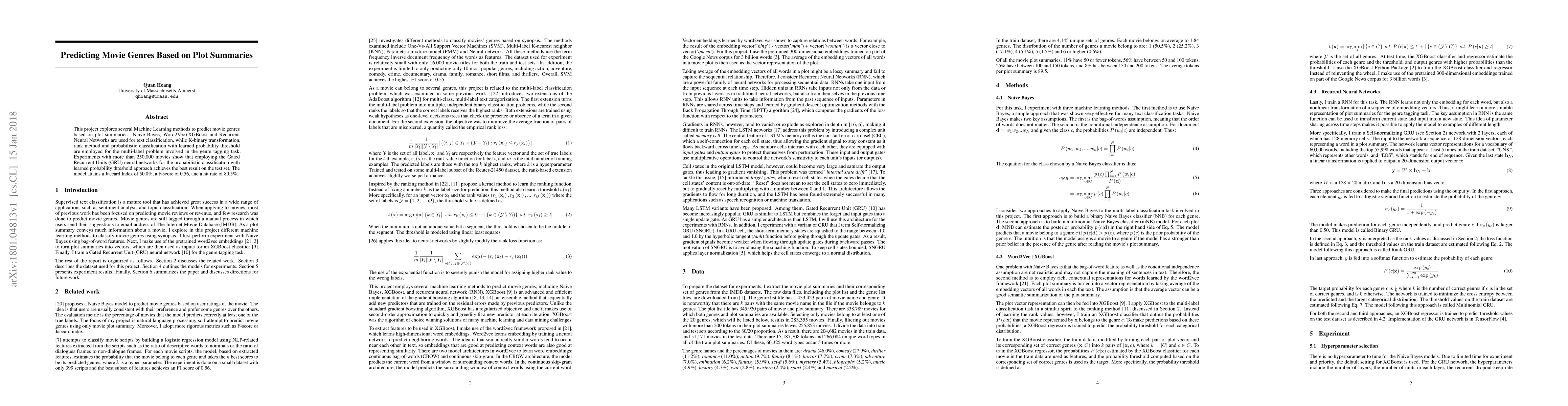 This study investigates various Machine Learning techniques for predicting movie genres from plot summaries, achieving the best results with Gated Recurrent Units (GRU) neural networks, which attained a Jaccard Index of 50.0%, a F-score of 0.56, and a hit rate of 80.5%.