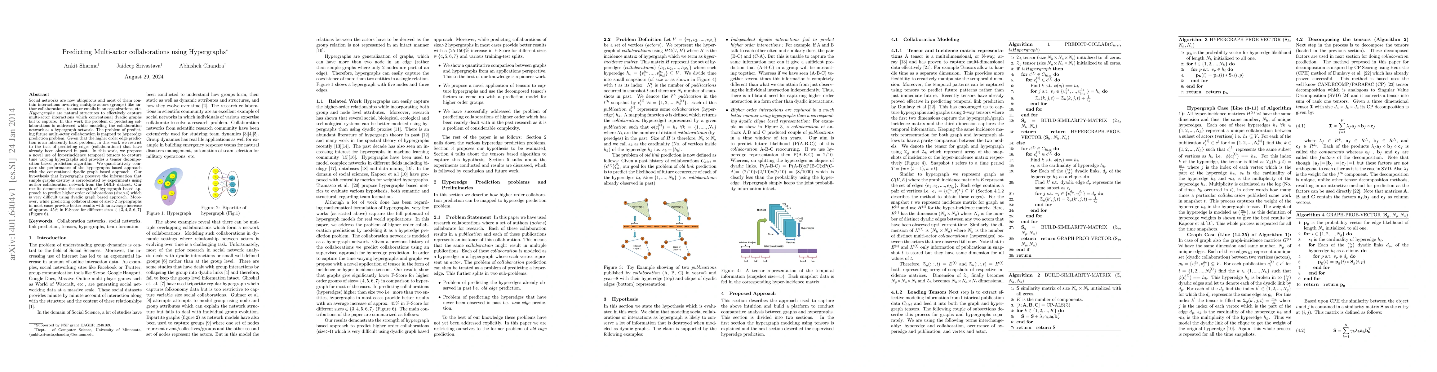Social networks are now ubiquitous and most of them contain interactions involving multiple actors (groups) like author collaborations, teams or emails in an organizations, etc. Hypergraphs are natural structures to effectively capture multi-actor interactions which conventional dyadic graphs fail to capture. In this work the problem of predicting collaborations is addressed while modeling the collaboration network as a hypergraph network. The problem of predicting future multi-actor collaboration is mapped to hyperedge prediction problem. Given that the higher order edge prediction is an inherently hard problem, in this work we restrict to the task of predicting edges (collaborations) that have already been observed in past. In this work, we propose a novel use of hyperincidence temporal tensors to capture time varying hypergraphs and provides a tensor decomposition based prediction algorithm. We quantitatively compare the performance of the hypergraphs based approach with the conventional dyadic graph based approach. Our hypothesis that hypergraphs preserve the information that simple graphs destroy is corroborated by experiments using author collaboration network from the DBLP dataset. Our results demonstrate the strength of hypergraph based approach to predict higher order collaborations (size>4) which is very difficult using dyadic graph based approach. Moreover, while predicting collaborations of size>2 hypergraphs in most cases provide better results with an average increase of approx. 45% in F-Score for different sizes = {3,4,5,6,7}.