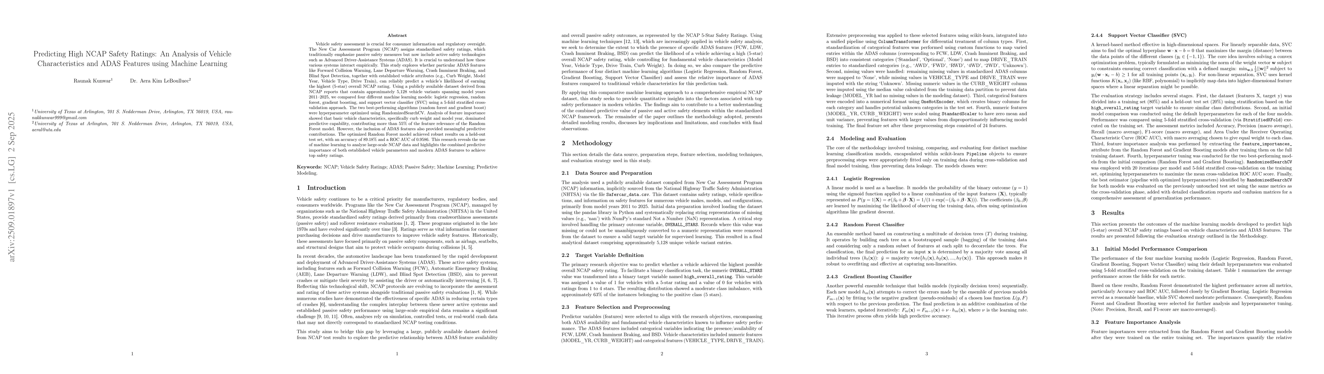 Vehicle safety assessment is crucial for consumer information and regulatory oversight. The New Car Assessment Program (NCAP) assigns standardized safety ratings, which traditionally emphasize passive safety measures but now include active safety technologies such as Advanced Driver-Assistance Systems (ADAS). It is crucial to understand how these various systems interact empirically. This study explores whether particular ADAS features like Forward Collision Warning, Lane Departure Warning, Crash Imminent Braking, and Blind Spot Detection, together with established vehicle attributes (e.g., Curb Weight, Model Year, Vehicle Type, Drive Train), can reliably predict a vehicle's likelihood of earning the highest (5-star) overall NCAP rating. Using a publicly available dataset derived from NCAP reports that contain approximately 5,128 vehicle variants spanning model years 2011-2025, we compared four different machine learning models: logistic regression, random forest, gradient boosting, and support vector classifier (SVC) using a 5-fold stratified cross-validation approach. The two best-performing algorithms (random forest and gradient boost) were hyperparameter optimized using RandomizedSearchCV. Analysis of feature importance showed that basic vehicle characteristics, specifically curb weight and model year, dominated predictive capability, contributing more than 55% of the feature relevance of the Random Forest model. However, the inclusion of ADAS features also provided meaningful predictive contributions. The optimized Random Forest model achieved robust results on a held-out test set, with an accuracy of 89.18% and a ROC AUC of 0.9586. This research reveals the use of machine learning to analyze large-scale NCAP data and highlights the combined predictive importance of both established vehicle parameters and modern ADAS features to achieve top safety ratings.