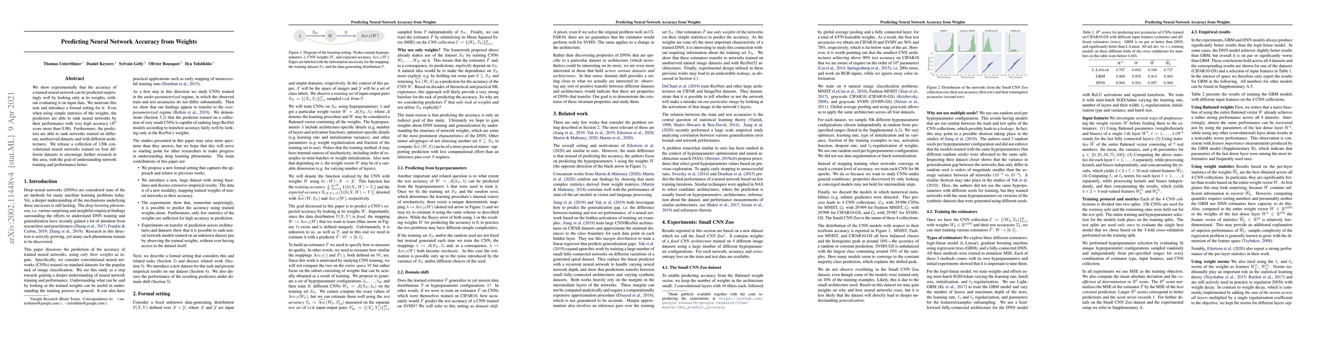 We show experimentally that the accuracy of a trained neural network can be predicted surprisingly well by looking only at its weights, without evaluating it on input data. We motivate this task and introduce a formal setting for it. Even when using simple statistics of the weights, the predictors are able to rank neural networks by their performance with very high accuracy (R2 score more than 0.98). Furthermore, the predictors are able to rank networks trained on different, unobserved datasets and with different architectures. We release a collection of 120k convolutional neural networks trained on four different datasets to encourage further research in this area, with the goal of understanding network training and performance better.