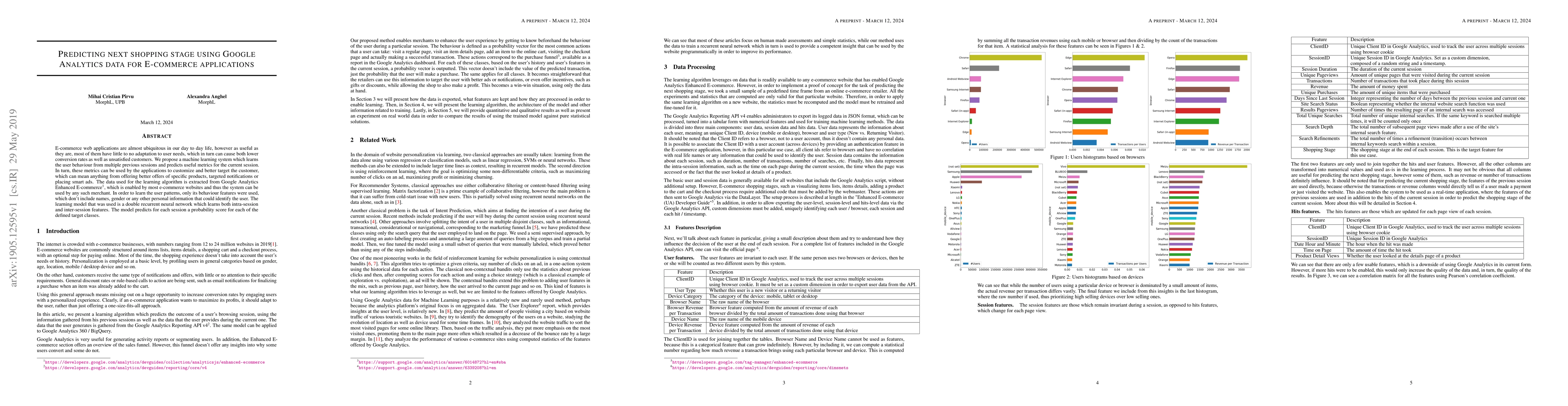 E-commerce web applications are almost ubiquitous in our day to day life, however as useful as they are, most of them have little to no adaptation to user needs, which in turn can cause both lower conversion rates as well as unsatisfied customers. We propose a machine learning system which learns the user behaviour from multiple previous sessions and predicts useful metrics for the current session. In turn, these metrics can be used by the applications to customize and better target the customer, which can mean anything from offering better offers of specific products, targeted notifications or placing smart ads. The data used for the learning algorithm is extracted from Google Analytics Enhanced E-commerce, which is enabled by most e-commerce websites and thus the system can be used by any such merchant. In order to learn the user patterns, only its behaviour features were used, which don't include names, gender or any other personal information that could identify the user. The learning model that was used is a double recurrent neural network which learns both intra-session and inter-session features. The model predicts for each session a probability score for each of the defined target classes.