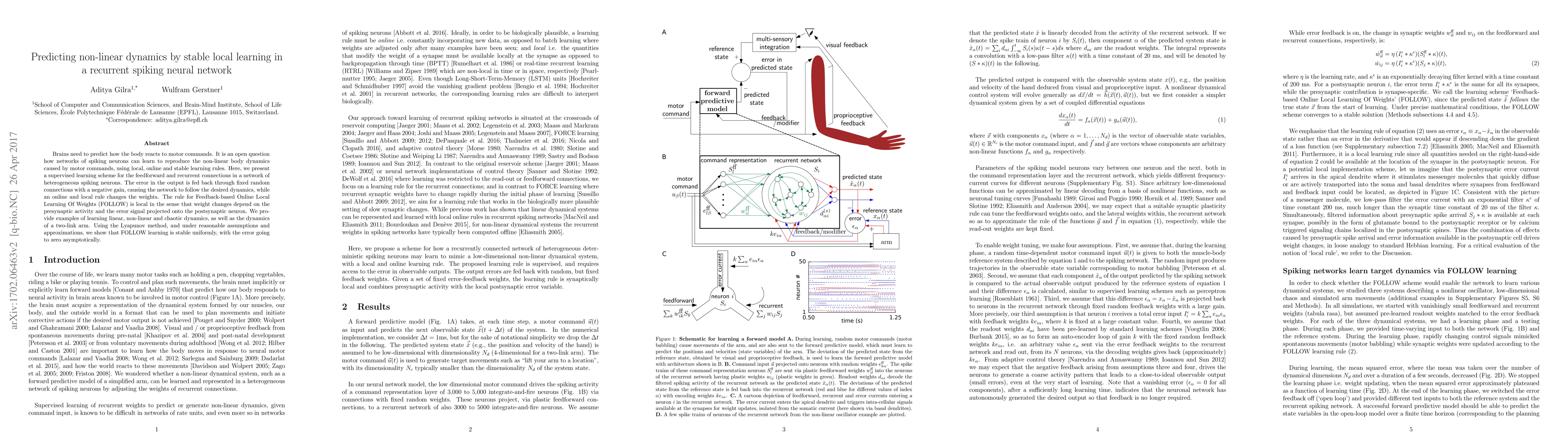 This paper proposes a supervised learning method called FOLLOW for a recurrent spiking neural network to predict non-linear dynamics. The method uses local, online weight updates and demonstrates stable learning for linear, non-linear, and chaotic dynamics, including a two-link arm.