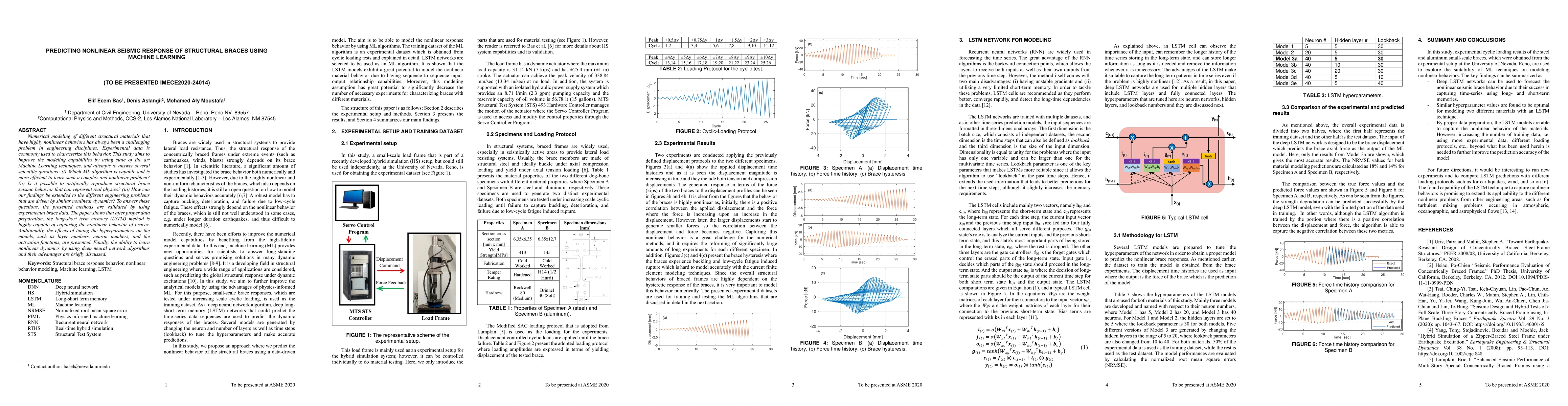 Numerical modeling of different structural materials that have highly nonlinear behaviors has always been a challenging problem in engineering disciplines. Experimental data is commonly used to characterize this behavior. This study aims to improve the modeling capabilities by using state of the art Machine Learning techniques, and attempts to answer several scientific questions: (i) Which ML algorithm is capable and is more efficient to learn such a complex and nonlinear problem? (ii) Is it possible to artificially reproduce structural brace seismic behavior that can represent real physics? (iii) How can our findings be extended to the different engineering problems that are driven by similar nonlinear dynamics? To answer these questions, the presented methods are validated by using experimental brace data. The paper shows that after proper data preparation, the long-short term memory (LSTM) method is highly capable of capturing the nonlinear behavior of braces. Additionally, the effects of tuning the hyperparameters on the models, such as layer numbers, neuron numbers, and the activation functions, are presented. Finally, the ability to learn nonlinear dynamics by using deep neural network algorithms and their advantages are briefly discussed.