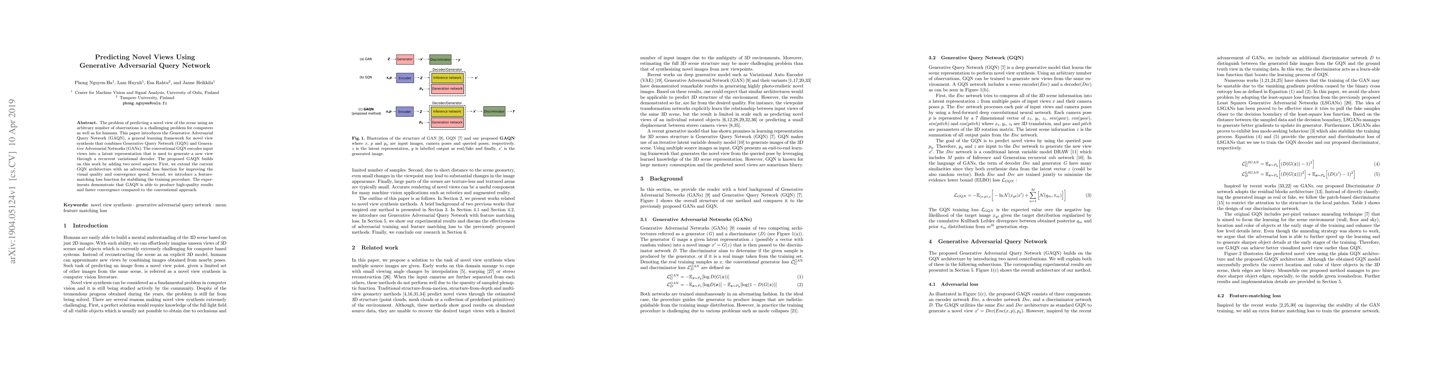 This paper proposes the Generative Adversarial Query Network (GAQN) for novel view synthesis, combining GQN and GANs to improve visual quality and training stability. Experiments show GAQN achieves higher quality and faster convergence than conventional GQN.