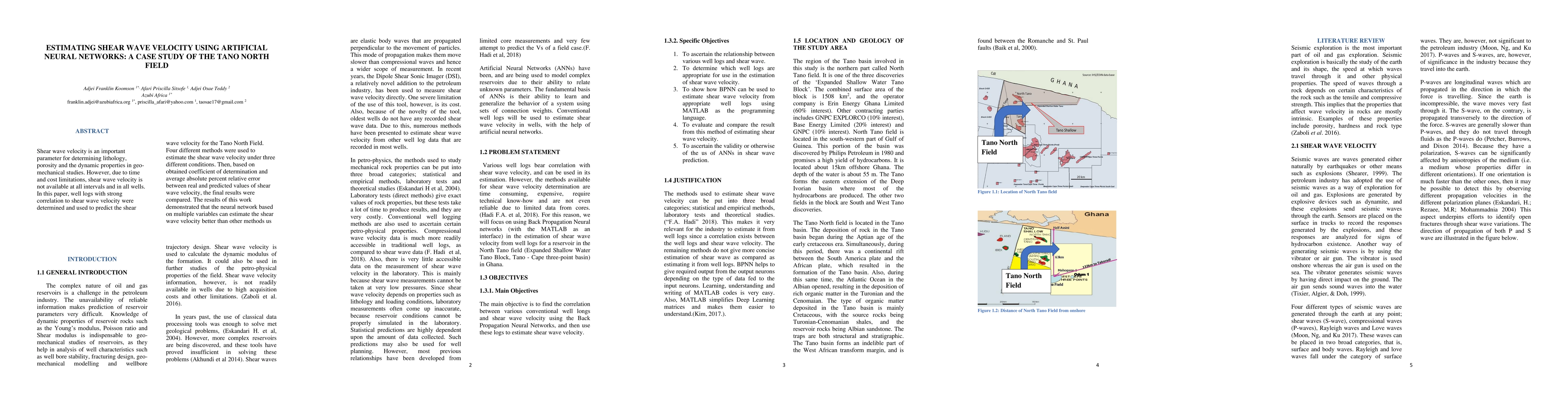 This paper investigates the use of artificial neural networks to predict shear wave velocity, a key parameter in geo-mechanical studies, for the Tano North Field. The study compares neural network predictions with other estimation methods, finding that neural networks provide more accurate estimates based on coefficient of determination and average absolute percent relative error.