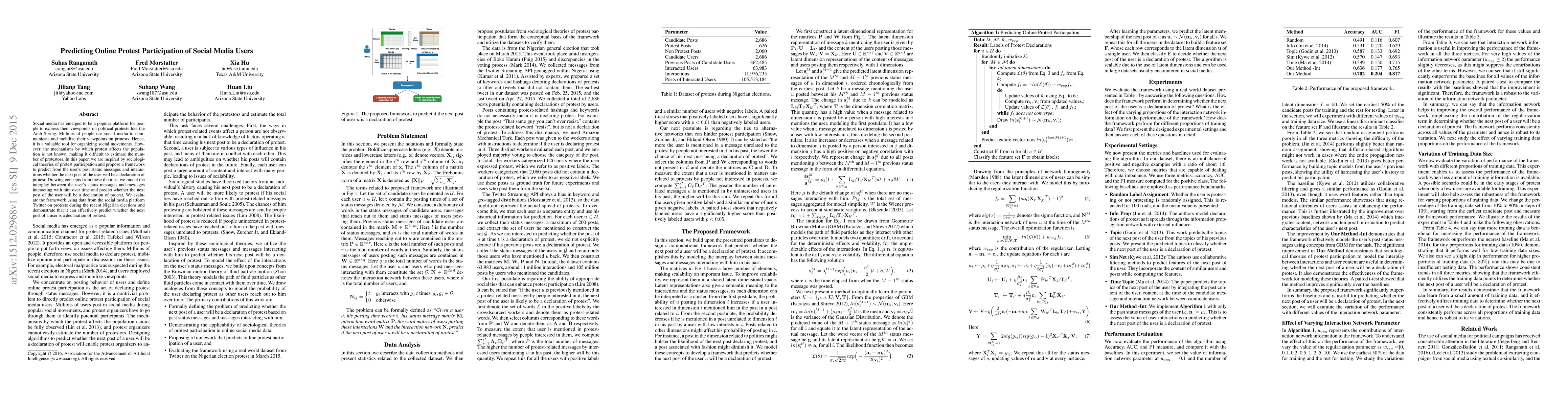 This paper proposes a framework to predict online protest participation on social media using past status messages and interactions, drawing from sociological theories. The model was evaluated using Twitter data from Nigerian election protests, demonstrating effective prediction of protest declarations.