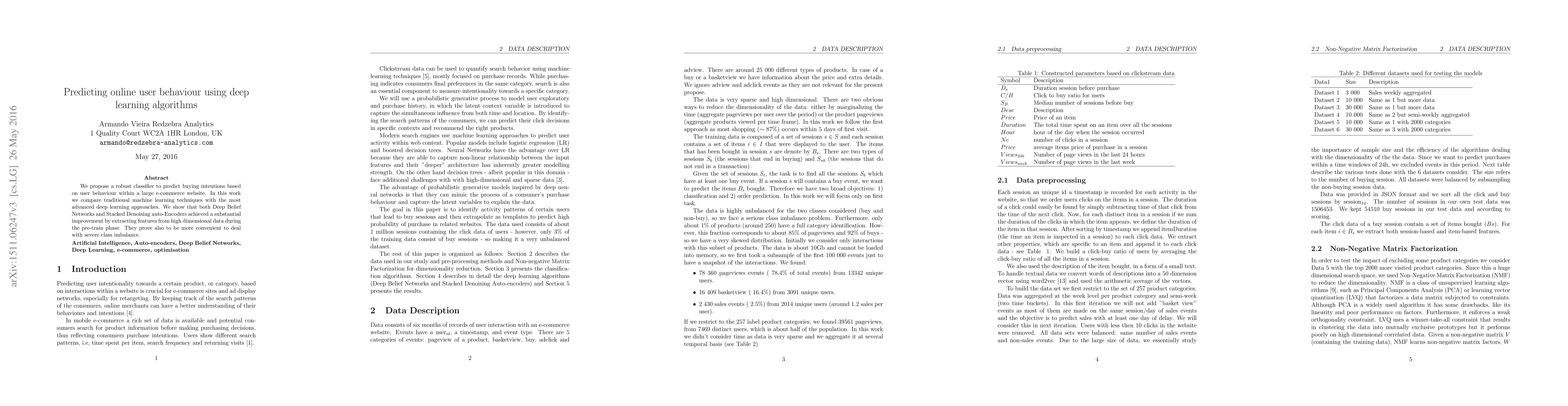 We propose a robust classifier to predict buying intentions based on user behaviour within a large e-commerce website. In this work we compare traditional machine learning techniques with the most advanced deep learning approaches. We show that both Deep Belief Networks and Stacked Denoising auto-Encoders achieved a substantial improvement by extracting features from high dimensional data during the pre-train phase. They prove also to be more convenient to deal with severe class imbalance.