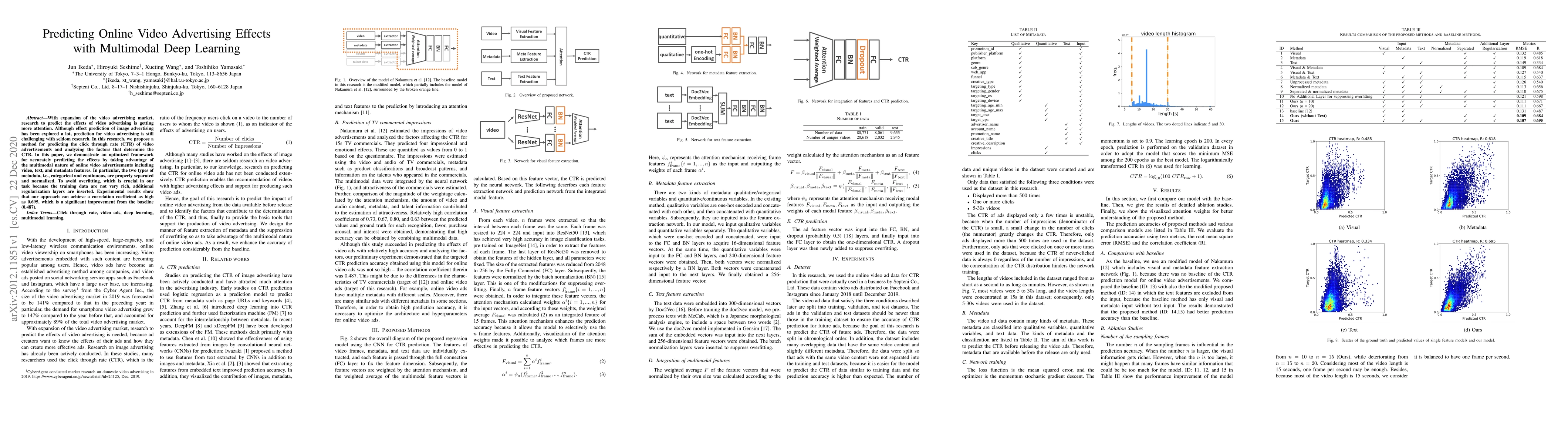 With expansion of the video advertising market, research to predict the effects of video advertising is getting more attention. Although effect prediction of image advertising has been explored a lot, prediction for video advertising is still challenging with seldom research. In this research, we propose a method for predicting the click through rate (CTR) of video advertisements and analyzing the factors that determine the CTR. In this paper, we demonstrate an optimized framework for accurately predicting the effects by taking advantage of the multimodal nature of online video advertisements including video, text, and metadata features. In particular, the two types of metadata, i.e., categorical and continuous, are properly separated and normalized. To avoid overfitting, which is crucial in our task because the training data are not very rich, additional regularization layers are inserted. Experimental results show that our approach can achieve a correlation coefficient as high as 0.695, which is a significant improvement from the baseline (0.487).