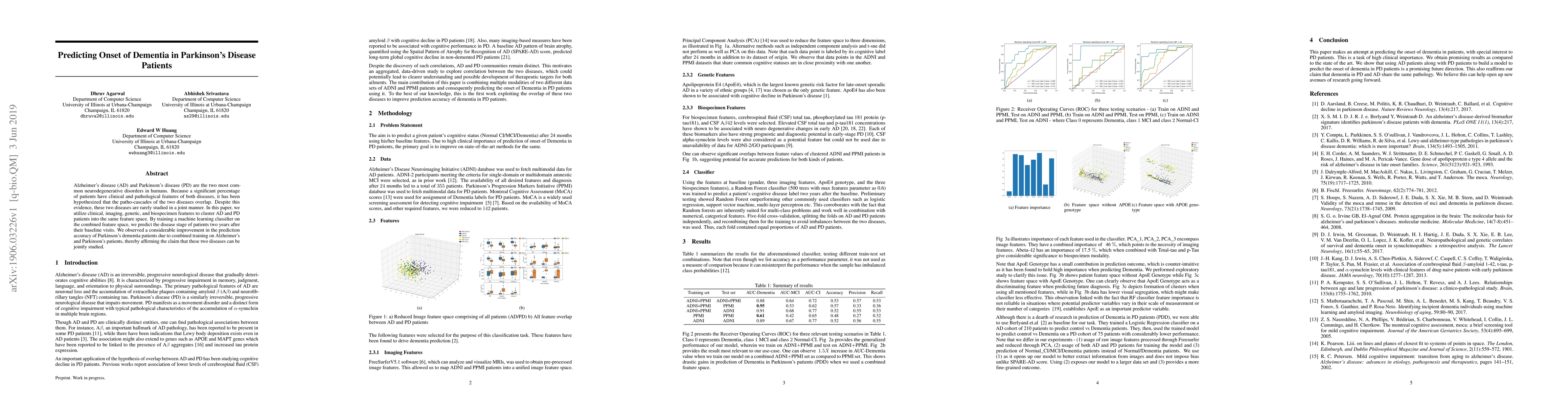 This paper employs a machine learning classifier trained on integrated clinical, imaging, genetic, and biospecimen features to predict the onset of dementia in Parkinson's disease patients. The study demonstrates improved prediction accuracy by jointly analyzing Alzheimer's and Parkinson's disease patients, supporting the hypothesis of overlapping patho-cascades between these neurodegenerative disorders.