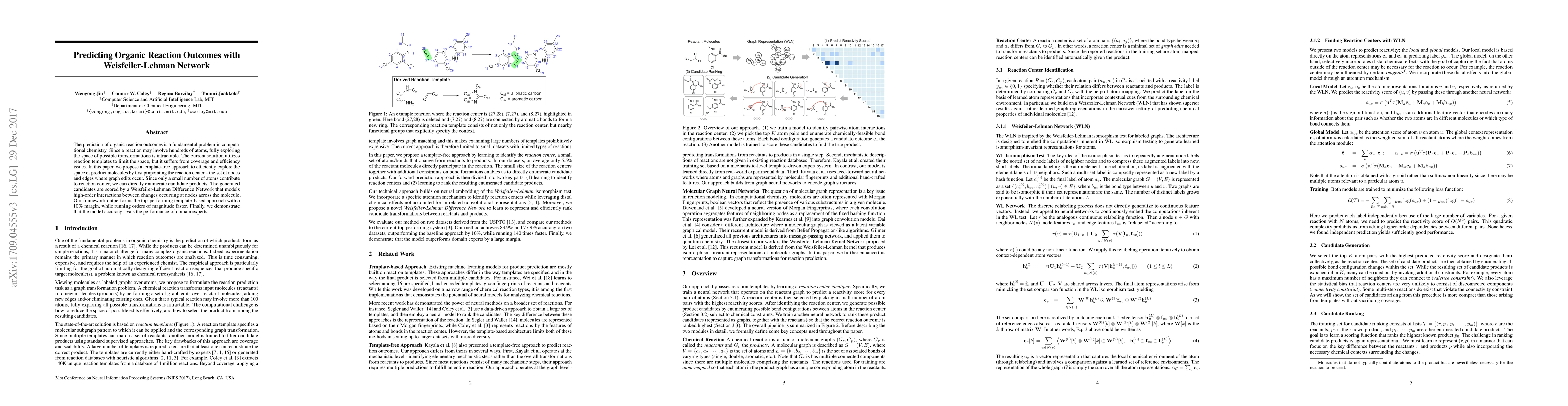 The prediction of organic reaction outcomes is a fundamental problem in computational chemistry. Since a reaction may involve hundreds of atoms, fully exploring the space of possible transformations is intractable. The current solution utilizes reaction templates to limit the space, but it suffers from coverage and efficiency issues. In this paper, we propose a template-free approach to efficiently explore the space of product molecules by first pinpointing the reaction center -- the set of nodes and edges where graph edits occur. Since only a small number of atoms contribute to reaction center, we can directly enumerate candidate products. The generated candidates are scored by a Weisfeiler-Lehman Difference Network that models high-order interactions between changes occurring at nodes across the molecule. Our framework outperforms the top-performing template-based approach with a 10\% margin, while running orders of magnitude faster. Finally, we demonstrate that the model accuracy rivals the performance of domain experts.