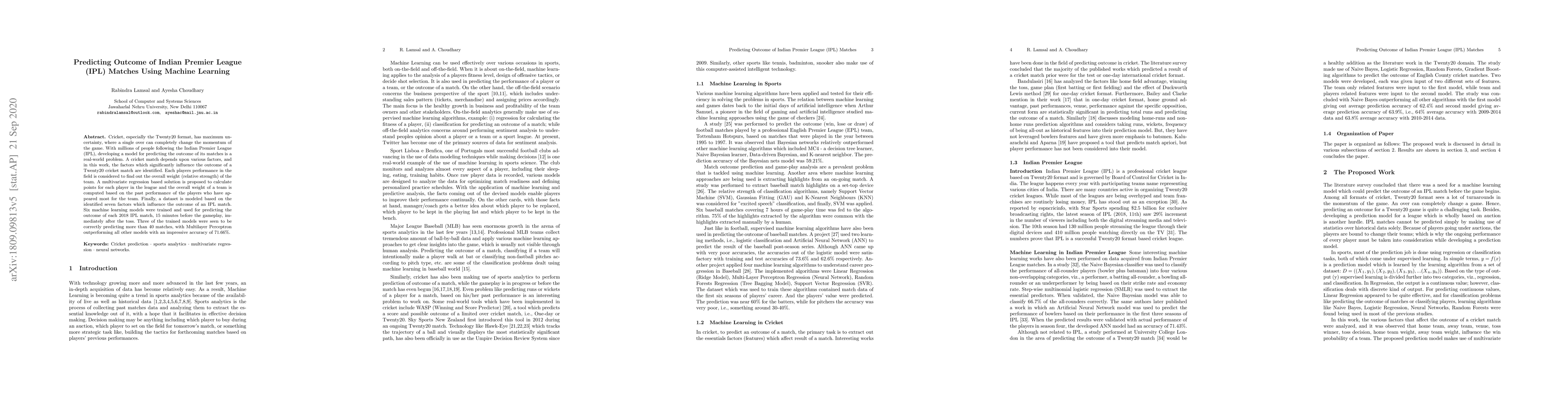 This research develops a machine learning model to predict the outcomes of Indian Premier League (IPL) Twenty20 cricket matches, identifying key factors like player performance and team strength. The study trains six models on a dataset based on seven influential factors, with the Multilayer Perceptron achieving an accuracy of 71.66% in predicting match results.