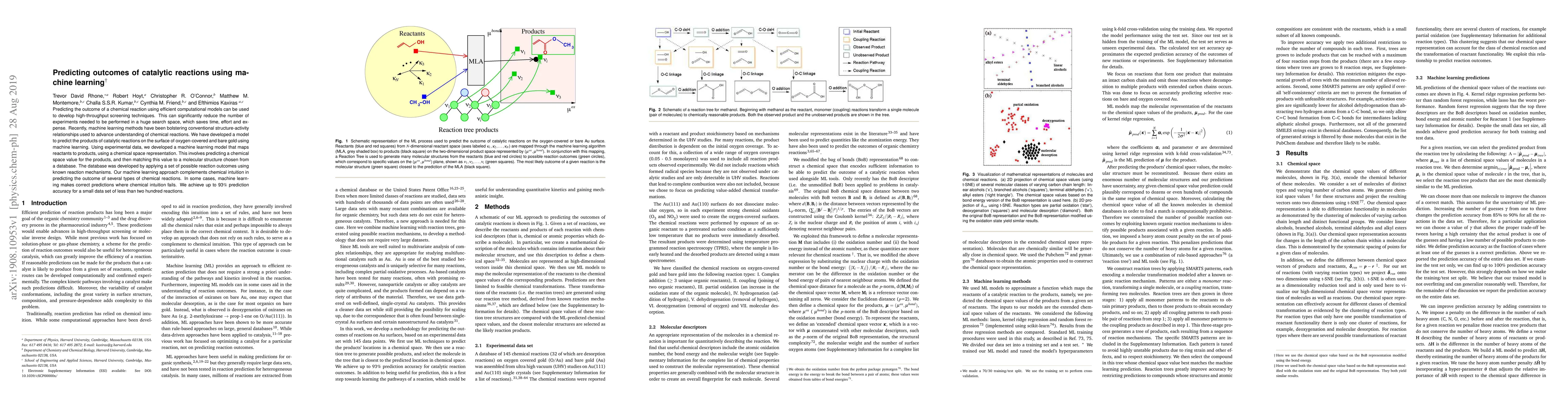 Predicting the outcome of a chemical reaction using efficient computational models can be used to develop high-throughput screening techniques. This can significantly reduce the number of experiments needed to be performed in a huge search space, which saves time, effort and expense. Recently, machine learning methods have been bolstering conventional structure-activity relationships used to advance understanding of chemical reactions. We have developed a model to predict the products of catalytic reactions on the surface of oxygen-covered and bare gold using machine learning. Using experimental data, we developed a machine learning model that maps reactants to products, using a chemical space representation. This involves predicting a chemical space value for the products, and then matching this value to a molecular structure chosen from a database. The database was developed by applying a set of possible reaction outcomes using known reaction mechanisms. Our machine learning approach complements chemical intuition in predicting the outcome of several types of chemical reactions. In some cases, machine learning makes correct predictions where chemical intuition fails. We achieve up to 93% prediction accuracy for a small data set of less than two hundred reactions.