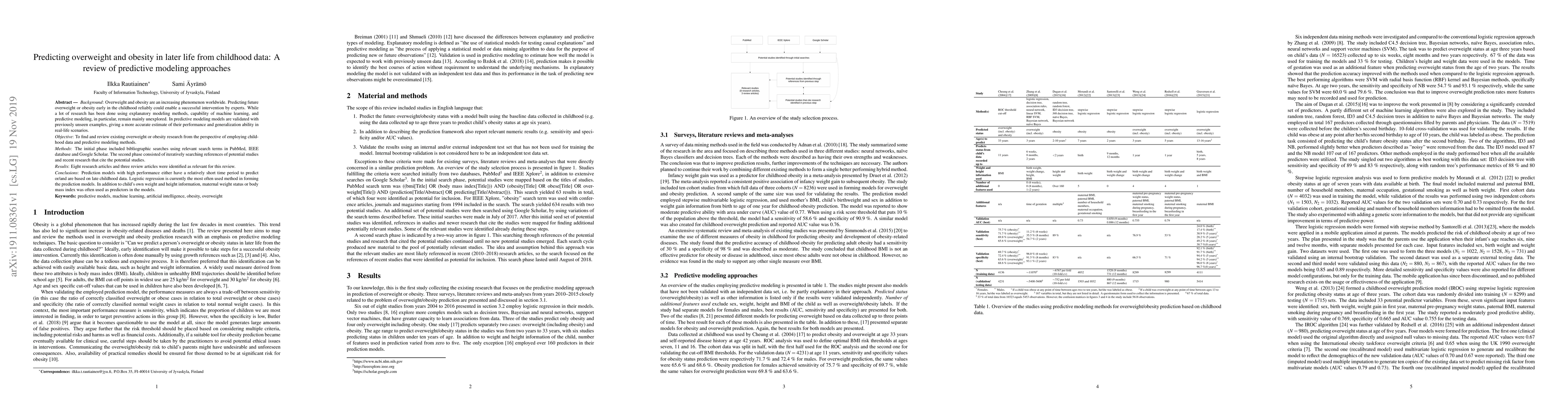 Background: Overweight and obesity are an increasing phenomenon worldwide. Predicting future overweight or obesity early in the childhood reliably could enable a successful intervention by experts. While a lot of research has been done using explanatory modeling methods, capability of machine learning, and predictive modeling, in particular, remain mainly unexplored. In predictive modeling models are validated with previously unseen examples, giving a more accurate estimate of their performance and generalization ability in real-life scenarios. Objective: To find and review existing overweight or obesity research from the perspective of employing childhood data and predictive modeling methods. Methods: The initial phase included bibliographic searches using relevant search terms in PubMed, IEEE database and Google Scholar. The second phase consisted of iteratively searching references of potential studies and recent research that cite the potential studies. Results: Eight research articles and three review articles were identified as relevant for this review. Conclusions: Prediction models with high performance either have a relatively short time period to predict or/and are based on late childhood data. Logistic regression is currently the most often used method in forming the prediction models. In addition to child's own weight and height information, maternal weight status or body mass index was often used as predictors in the models.