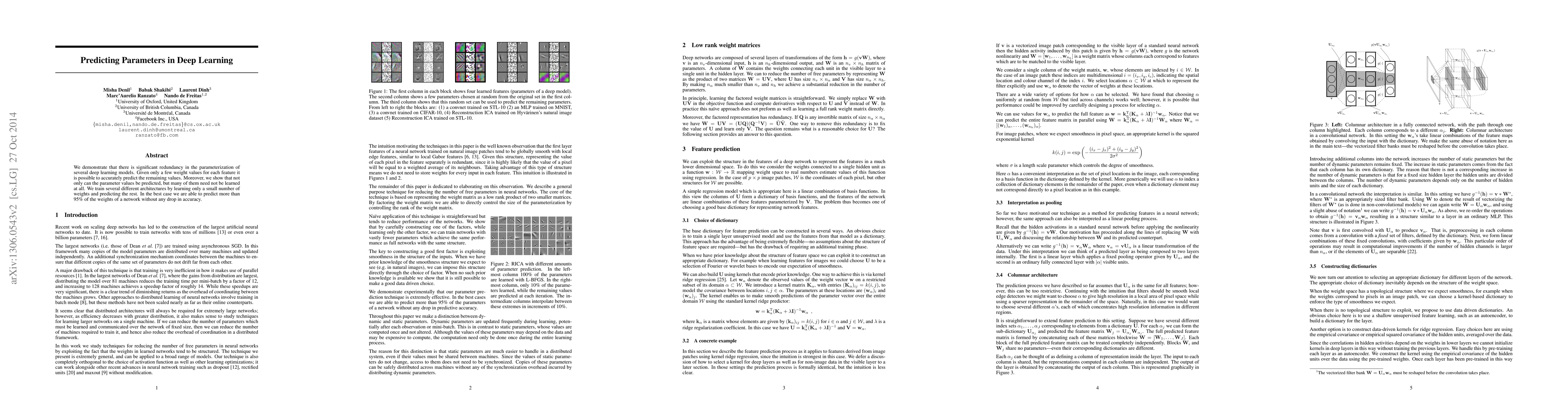 We demonstrate that there is significant redundancy in the parameterization of several deep learning models. Given only a few weight values for each feature it is possible to accurately predict the remaining values. Moreover, we show that not only can the parameter values be predicted, but many of them need not be learned at all. We train several different architectures by learning only a small number of weights and predicting the rest. In the best case we are able to predict more than 95% of the weights of a network without any drop in accuracy.