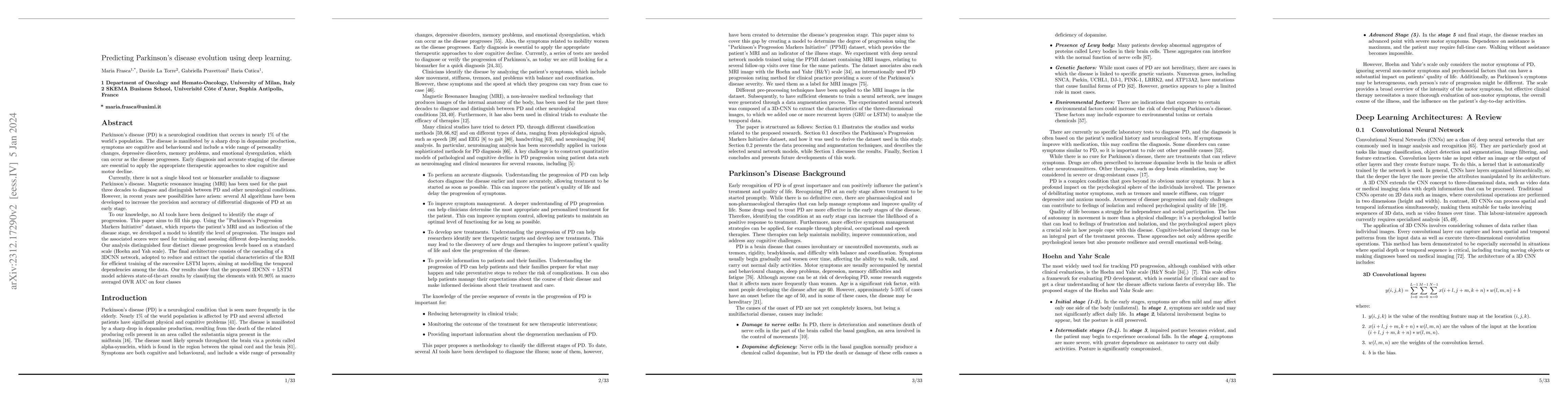 Parkinson's disease is a neurological condition that occurs in nearly 1% of the world's population. The disease is manifested by a drop in dopamine production, symptoms are cognitive and behavioural and include a wide range of personality changes, depressive disorders, memory problems, and emotional dysregulation, which can occur as the disease progresses. Early diagnosis and accurate staging of the disease are essential to apply the appropriate therapeutic approaches to slow cognitive and motor decline. Currently, there is not a single blood test or biomarker available to diagnose Parkinson's disease. Magnetic resonance imaging has been used for the past three decades to diagnose and distinguish between PD and other neurological conditions. However, in recent years new possibilities have arisen: several AI algorithms have been developed to increase the precision and accuracy of differential diagnosis of PD at an early stage. To our knowledge, no AI tools have been designed to identify the stage of progression. This paper aims to fill this gap. Using the "Parkinson's Progression Markers Initiative" dataset, which reports the patient's MRI and an indication of the disease stage, we developed a model to identify the level of progression. The images and the associated scores were used for training and assessing different deep-learning models. Our analysis distinguished four distinct disease progression levels based on a standard scale (Hoehn and Yah scale). The final architecture consists of the cascading of a 3DCNN network, adopted to reduce and extract the spatial characteristics of the RMI for efficient training of the successive LSTM layers, aiming at modelling the temporal dependencies among the data. Our results show that the proposed 3DCNN + LSTM model achieves state-of-the-art results by classifying the elements with 91.90\% as macro averaged OVR AUC on four classes