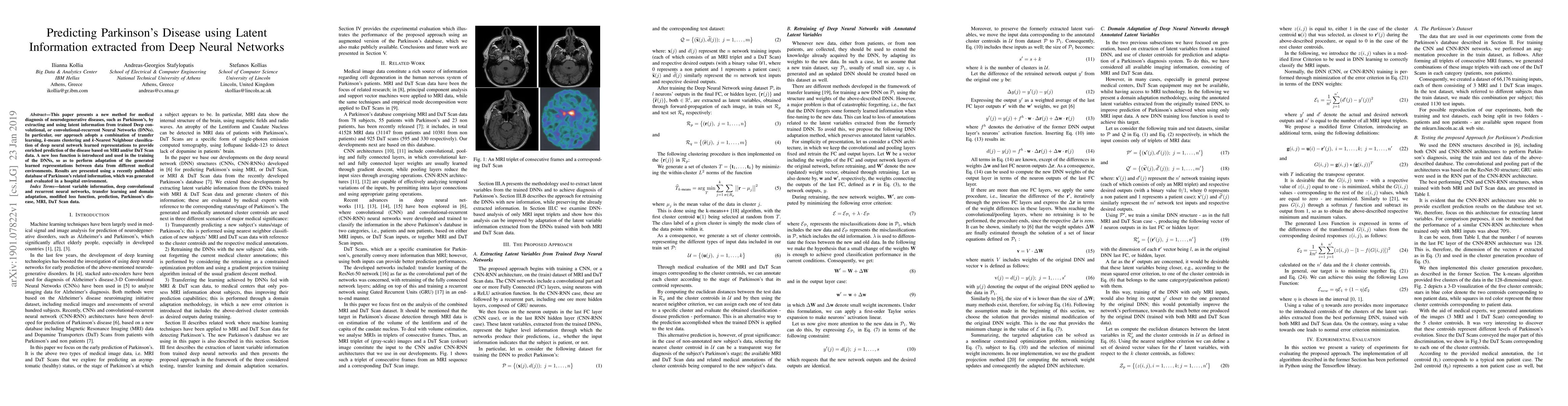 This paper proposes a novel method for diagnosing Parkinson's disease using latent information extracted from trained Deep Neural Networks, combining transfer learning, k-means clustering, and k-Nearest Neighbor classification. The approach adapts learned representations across different medical environments using a new loss function, demonstrating effectiveness on a hospital-generated dataset.