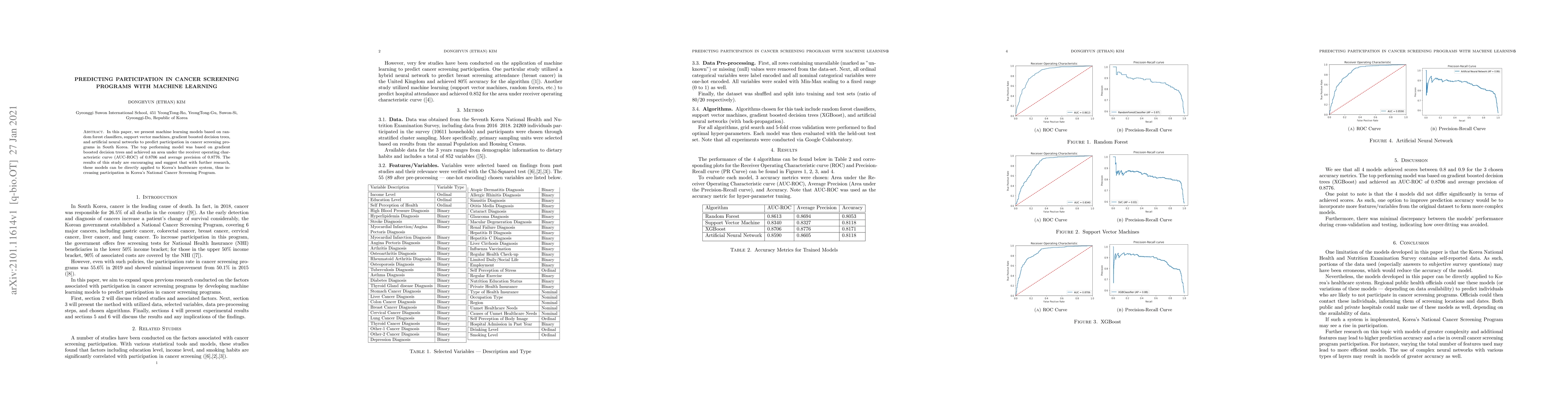 In this paper, we present machine learning models based on random forest classifiers, support vector machines, gradient boosted decision trees, and artificial neural networks to predict participation in cancer screening programs in South Korea. The top performing model was based on gradient boosted decision trees and achieved an area under the receiver operating characteristic curve (AUC-ROC) of 0.8706 and average precision of 0.8776. The results of this study are encouraging and suggest that with further research, these models can be directly applied to Korea's healthcare system, thus increasing participation in Korea's National Cancer Screening Program.