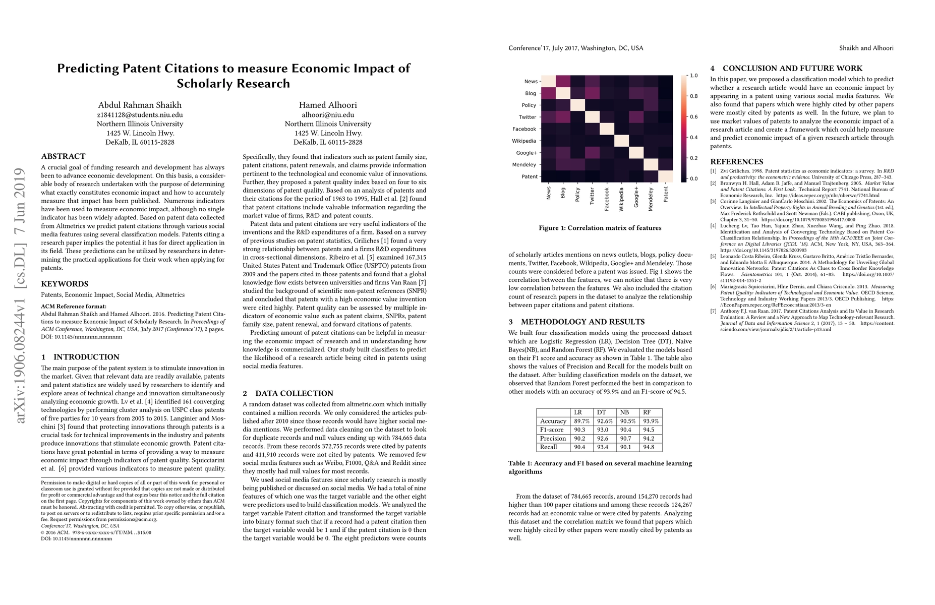 A crucial goal of funding research and development has always been to advance economic development. On this basis, a consider-able body of research undertaken with the purpose of determining what exactly constitutes economic impact and how to accurately measure that impact has been published. Numerous indicators have been used to measure economic impact, although no single indicator has been widely adapted. Based on patent data collected from Altmetric we predict patent citations through various social media features using several classification models. Patents citing a research paper implies the potential it has for direct application inits field. These predictions can be utilized by researchers in deter-mining the practical applications for their work when applying for patents.