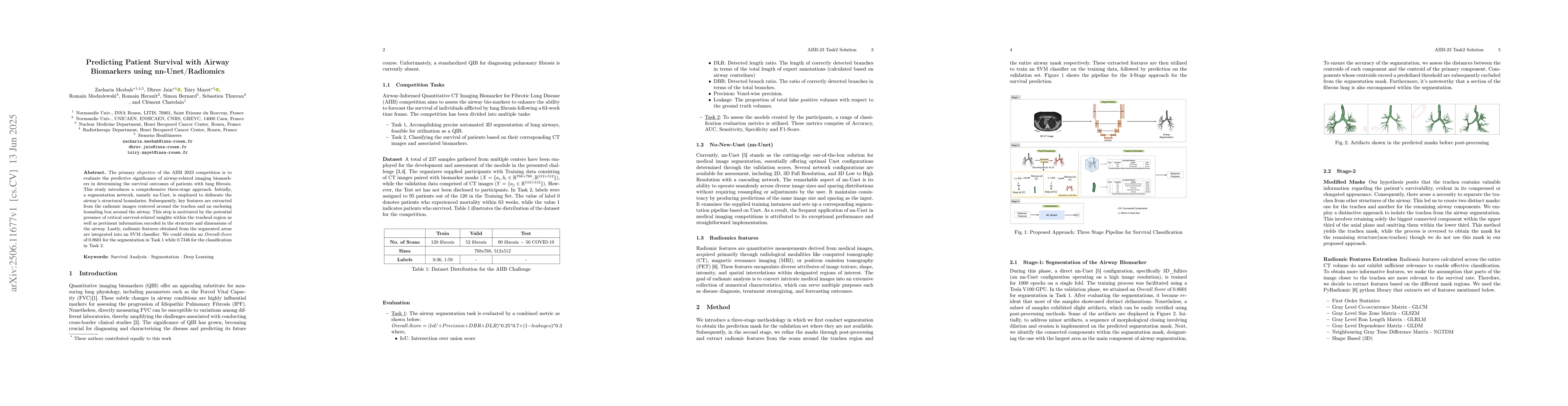 The primary objective of the AIIB 2023 competition is to evaluate the predictive significance of airway-related imaging biomarkers in determining the survival outcomes of patients with lung fibrosis.This study introduces a comprehensive three-stage approach. Initially, a segmentation network, namely nn-Unet, is employed to delineate the airway's structural boundaries. Subsequently, key features are extracted from the radiomic images centered around the trachea and an enclosing bounding box around the airway. This step is motivated by the potential presence of critical survival-related insights within the tracheal region as well as pertinent information encoded in the structure and dimensions of the airway. Lastly, radiomic features obtained from the segmented areas are integrated into an SVM classifier. We could obtain an overall-score of 0.8601 for the segmentation in Task 1 while 0.7346 for the classification in Task 2.