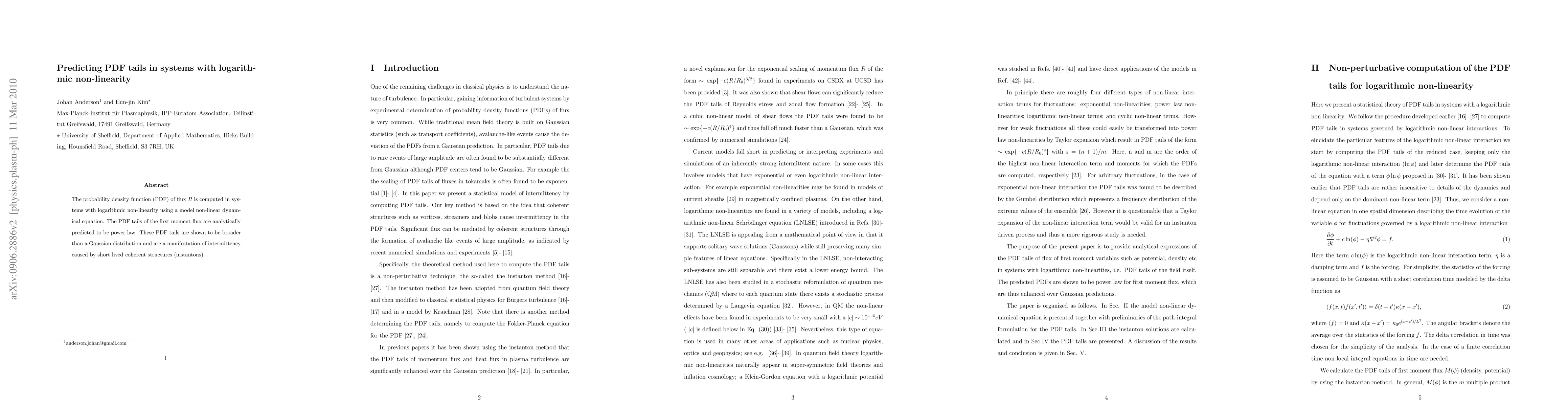 This paper predicts the power law tails of the probability density function (PDF) for flux in systems with logarithmic non-linearity, demonstrating broader tails than Gaussian distributions and attributing this intermittency to short-lived coherent structures known as instantons.