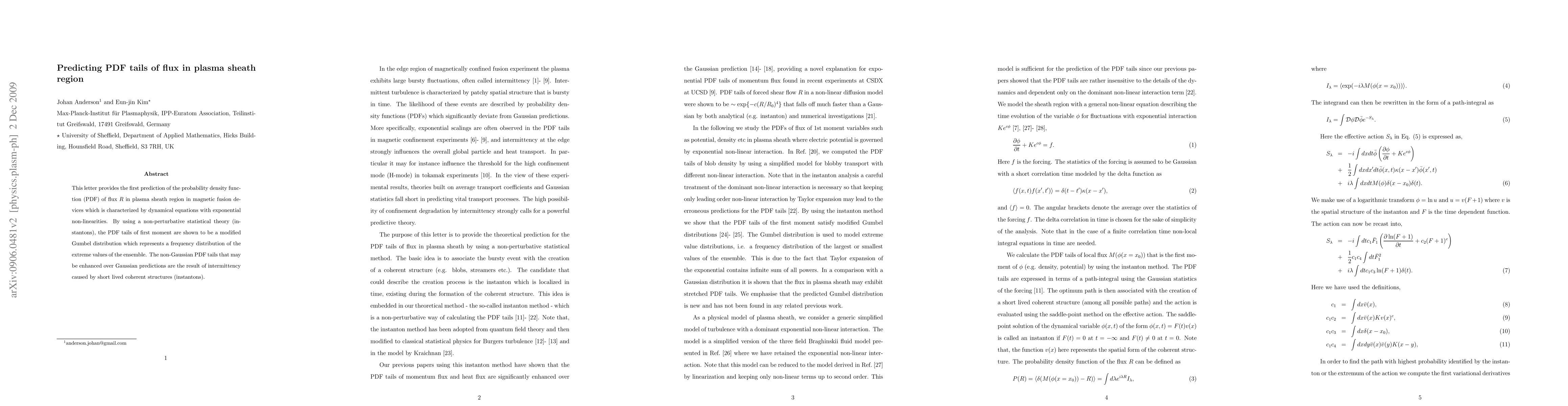 This paper predicts the probability density function (PDF) of flux in the plasma sheath region of magnetic fusion devices using a non-perturbative statistical theory, revealing non-Gaussian tails modeled as a modified Gumbel distribution due to intermittency from short-lived coherent structures.