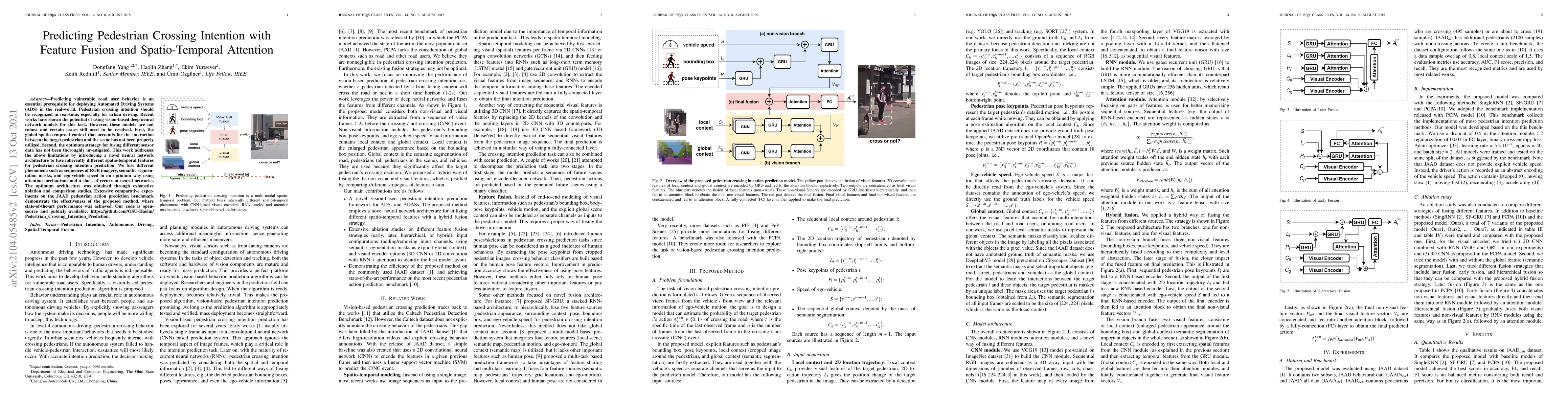 This paper proposes a novel neural network architecture that fuses spatio-temporal features, including RGB imagery, semantic segmentation, and vehicle speed, to predict pedestrian crossing intentions. The method uses attention mechanisms and recurrent neural networks, achieving state-of-the-art performance on the JAAD benchmark.