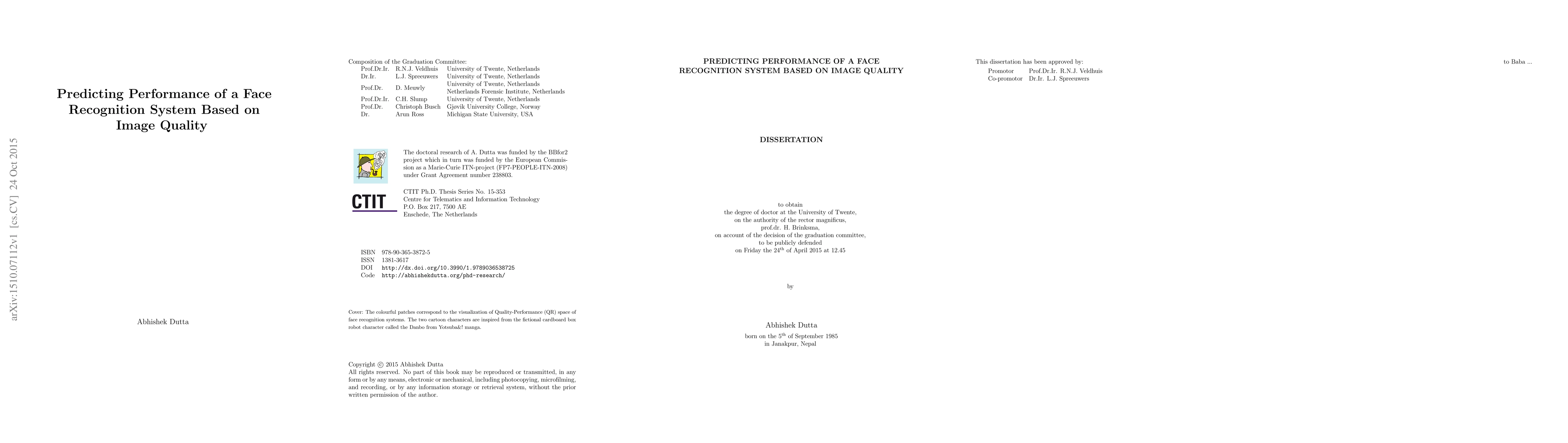 In this dissertation, we present a generative model to capture the relation between facial image quality features (like pose, illumination direction, etc) and face recognition performance. Such a model can be used to predict the performance of a face recognition system. Since the model is based solely on image quality features, performance predictions can be done even before the actual recognition has taken place thereby facilitating many preemptive action. A practical limitation of such a data driven generative model is the limited nature of training data set. To address this limitation, we have developed a Bayesian approach to model the distribution of recognition performance measure based on the number of match and non-match scores in small regions of the image quality space. Random samples drawn from these models provide the initial data essential for training the generative model. Experiment results based on six face recognition systems operating on three independent data sets show that the proposed performance prediction model can accurately predict face recognition performance using an accurate and unbiased Image Quality Assessor (IQA). Furthermore, our results show that variability in the unaccounted quality space -- the image quality features not considered by the IQA -- is the major factor causing inaccuracies in predicted performance.