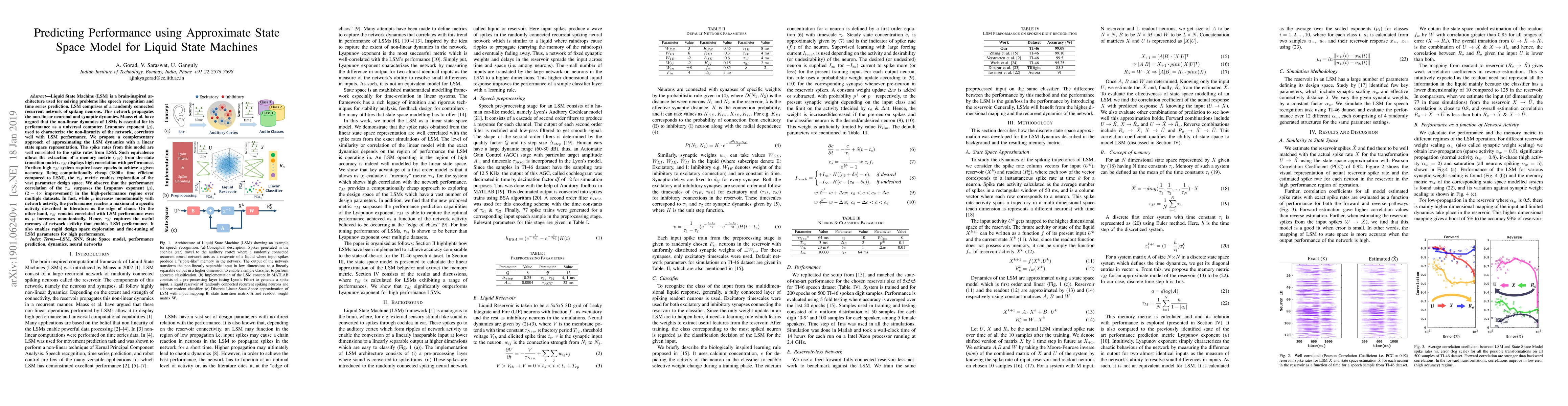 This paper proposes a linear state space model to approximate the dynamics of Liquid State Machines (LSM), showing that spike rates from this model correlate well with LSM. The derived "memory" metric (tau_M) correlates better with LSM performance than the Lyapunov exponent, enabling faster exploration of parameter design spaces and achieving higher performance.