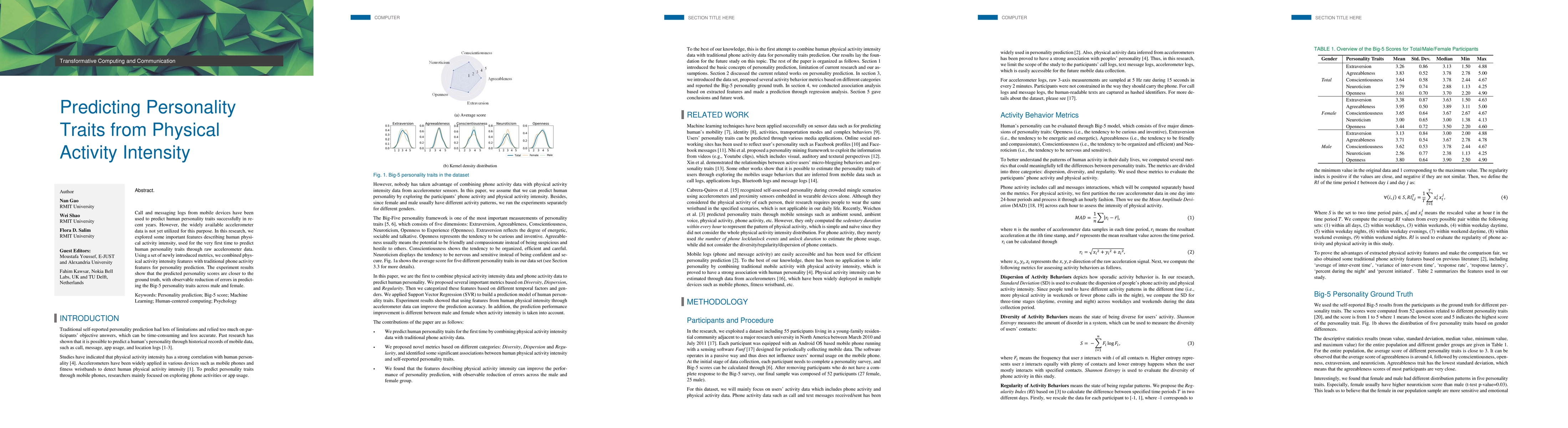 This research investigates the use of accelerometer data from mobile devices to predict human personality traits, specifically the Big-5 traits, by introducing new metrics for physical activity intensity. The study combines these novel metrics with traditional phone activity features, demonstrating improved accuracy in predicting personality traits compared to previous methods.