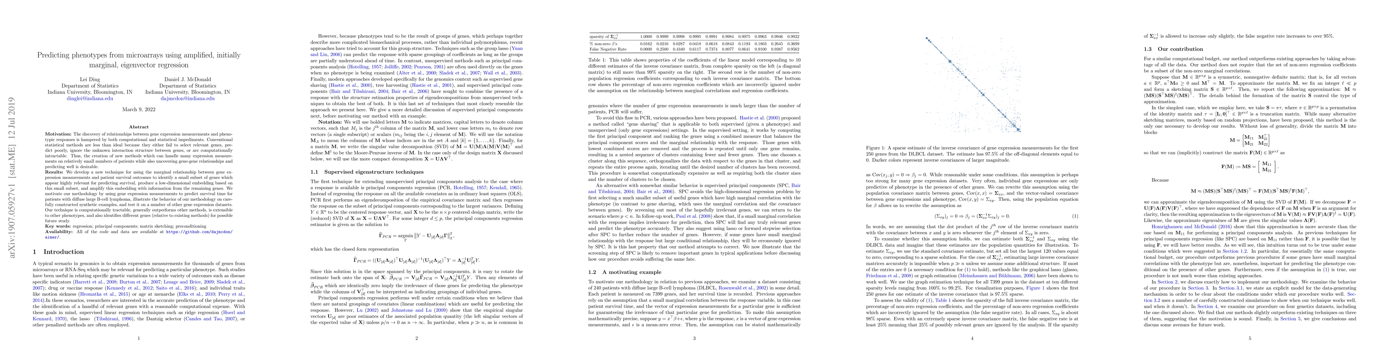 Motivation: The discovery of relationships between gene expression measurements and phenotypic responses is hampered by both computational and statistical impediments. Conventional statistical methods are less than ideal because they either fail to select relevant genes, predict poorly, ignore the unknown interaction structure between genes, or are computationally intractable. Thus, the creation of new methods which can handle many expression measurements on relatively small numbers of patients while also uncovering gene-gene relationships and predicting well is desirable. Results: We develop a new technique for using the marginal relationship between gene expression measurements and patient survival outcomes to identify a small subset of genes which appear highly relevant for predicting survival, produce a low-dimensional embedding based on this small subset, and amplify this embedding with information from the remaining genes. We motivate our methodology by using gene expression measurements to predict survival time for patients with diffuse large B-cell lymphoma, illustrate the behavior of our methodology on carefully constructed synthetic examples, and test it on a number of other gene expression datasets. Our technique is computationally tractable, generally outperforms other methods, is extensible to other phenotypes, and also identifies different genes (relative to existing methods) for possible future study. Key words: regression; principal components; matrix sketching; preconditioning Availability: All of the code and data are available at https://github.com/dajmcdon/aimer/.