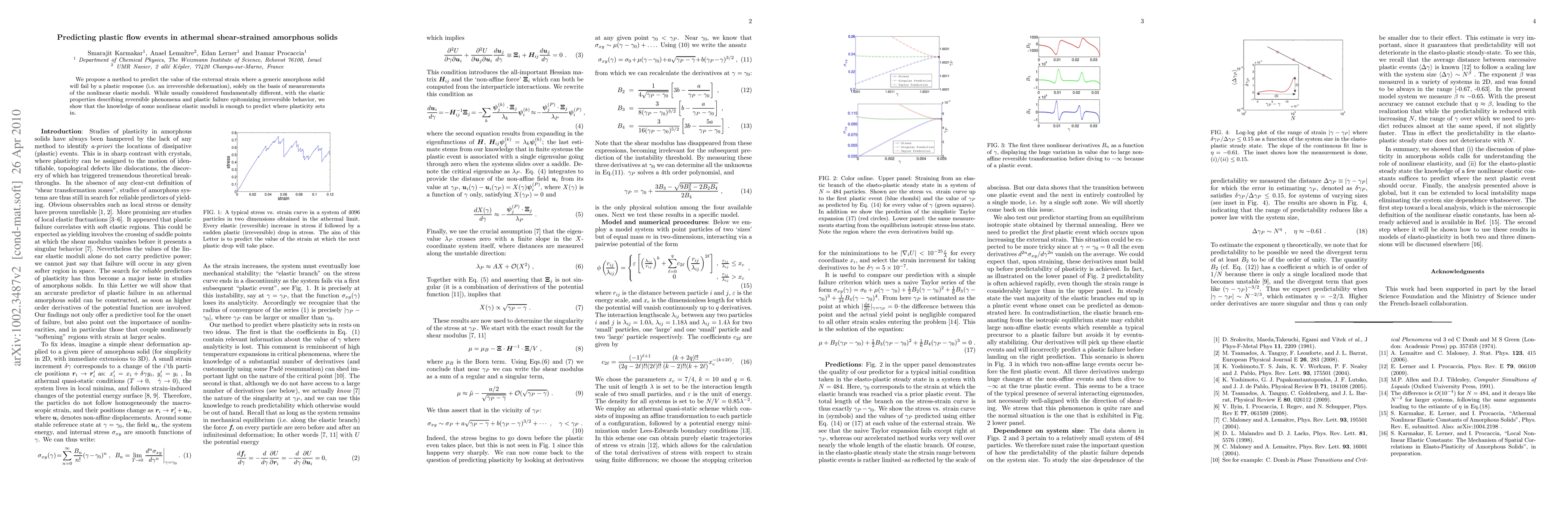 This paper proposes a novel method to predict the onset of plastic flow in amorphous solids by analyzing their nonlinear elastic moduli, demonstrating that elastic properties can provide insights into irreversible deformation.