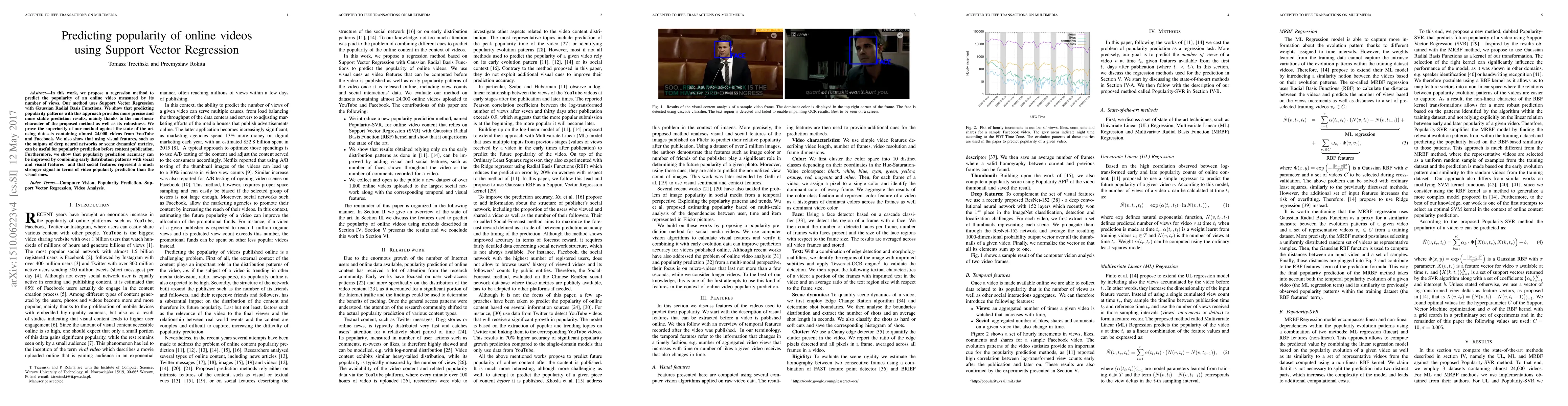 This paper proposes a Support Vector Regression method with Gaussian Radial Basis Functions to predict online video popularity based on temporal and visual cues, demonstrating superior performance and stability over existing methods, especially when incorporating early distribution patterns and additional social and visual metadata. The method is tested on datasets from YouTube and Facebook comprising over 14,000 videos.