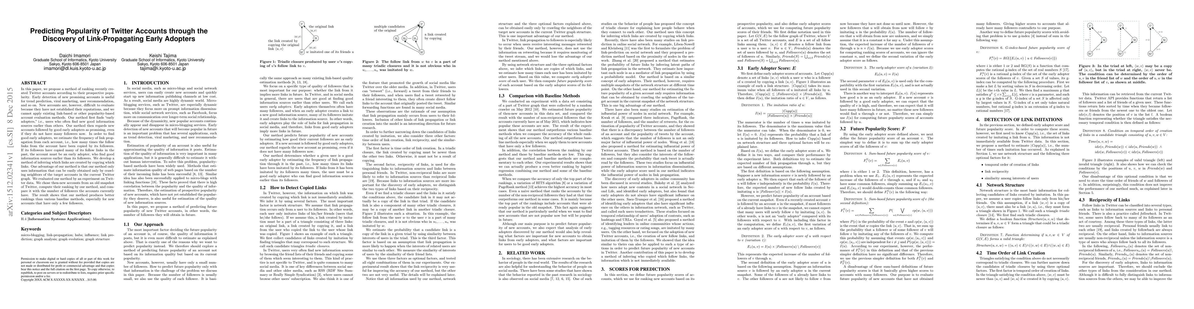 This paper proposes a method to rank newly created Twitter accounts based on their potential popularity by identifying "early adopters" who frequently discover valuable information sources. The method estimates link propagation frequency to determine promising accounts, even if they currently have few followers, and demonstrates superior ranking performance compared to baseline methods.