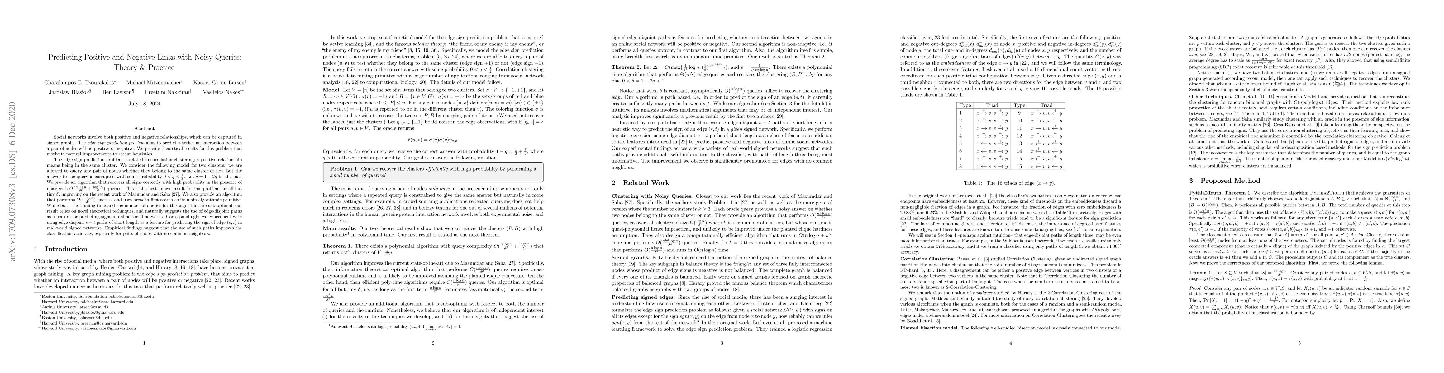 This paper presents theoretical and practical approaches to predicting positive and negative links in noisy social networks. It introduces an algorithm that efficiently recovers edge signs with a minimal number of queries, improving upon existing heuristics, and suggests using edge-disjoint paths as a feature to enhance prediction accuracy in real-world networks.