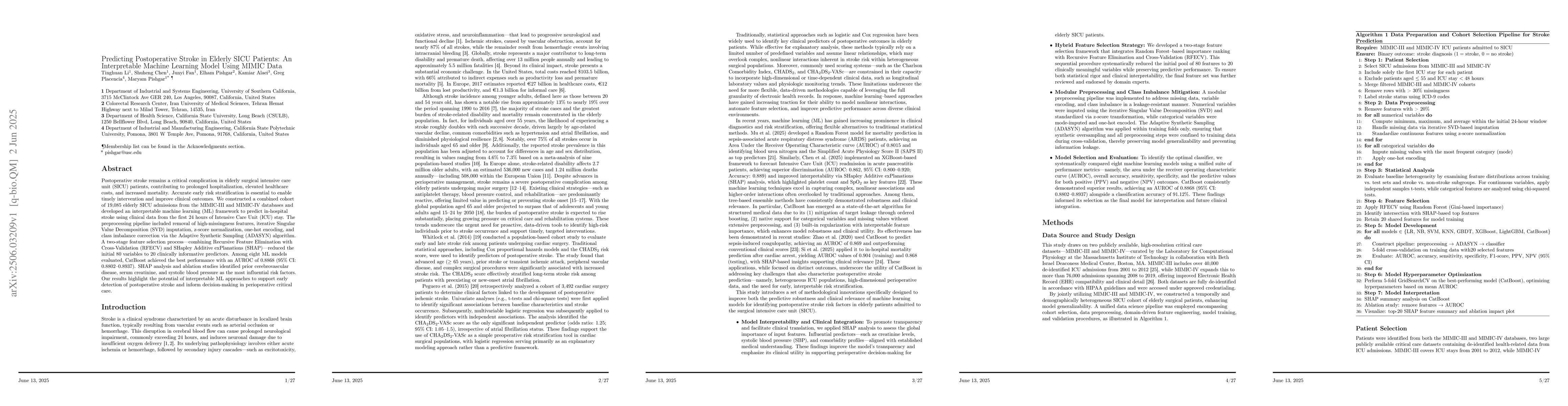 This study developed an interpretable machine learning model using MIMIC data to predict postoperative stroke in elderly SICU patients, identifying key risk factors such as prior cerebrovascular disease and blood pressure.