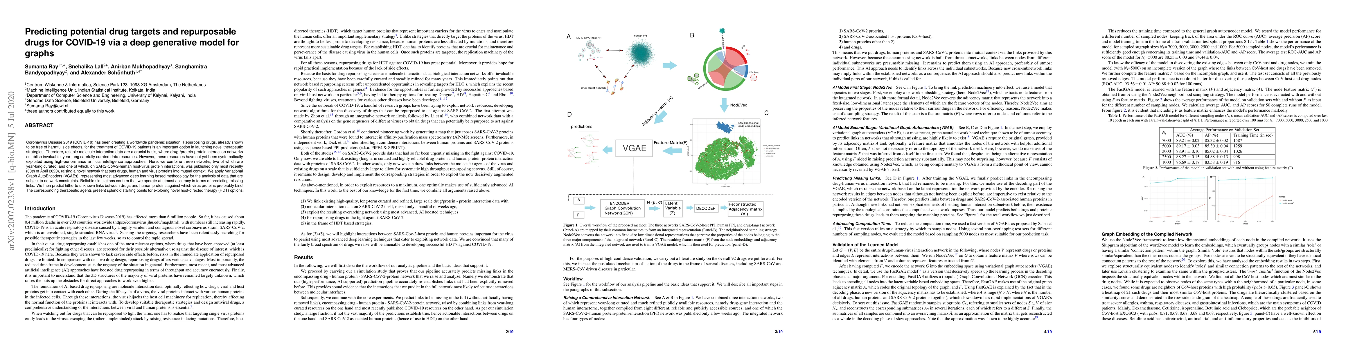 Coronavirus Disease 2019 (COVID-19) has been creating a worldwide pandemic situation. Repurposing drugs, already shown to be free of harmful side effects, for the treatment of COVID-19 patients is an important option in launching novel therapeutic strategies. Therefore, reliable molecule interaction data are a crucial basis, where drug-/protein-protein interaction networks establish invaluable, year-long carefully curated data resources. However, these resources have not yet been systematically exploited using high-performance artificial intelligence approaches. Here, we combine three networks, two of which are year-long curated, and one of which, on SARS-CoV-2-human host-virus protein interactions, was published only most recently (30th of April 2020), raising a novel network that puts drugs, human and virus proteins into mutual context. We apply Variational Graph AutoEncoders (VGAEs), representing most advanced deep learning based methodology for the analysis of data that are subject to network constraints. Reliable simulations confirm that we operate at utmost accuracy in terms of predicting missing links. We then predict hitherto unknown links between drugs and human proteins against which virus proteins preferably bind. The corresponding therapeutic agents present splendid starting points for exploring novel host-directed therapy (HDT) options.