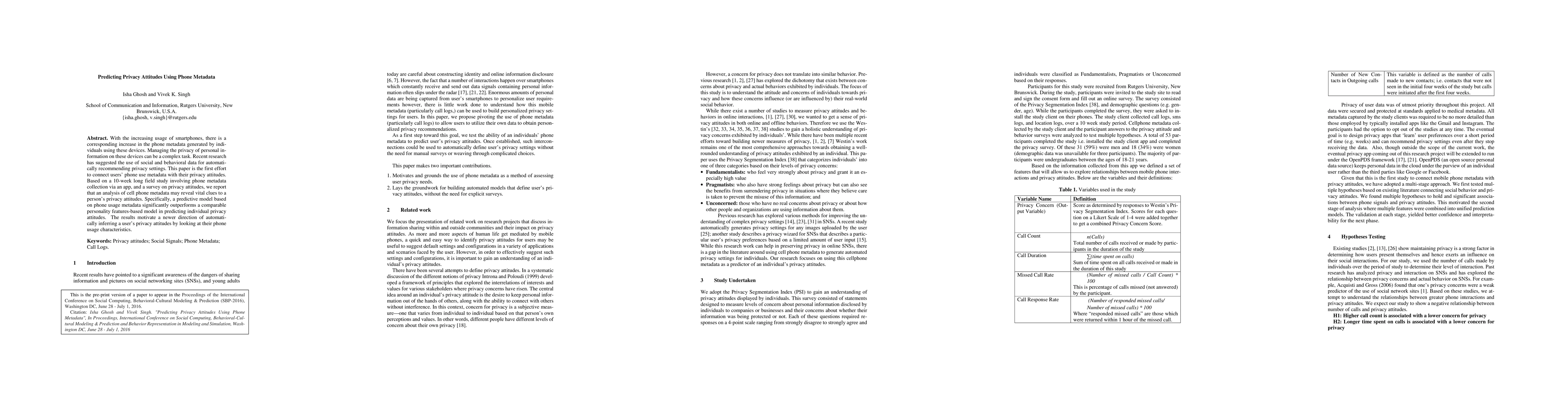 This study investigates the relationship between phone metadata and privacy attitudes through a 10-week field study. It finds that phone usage metadata can significantly predict privacy attitudes better than personality features, suggesting a new approach for automatically inferring user privacy preferences.