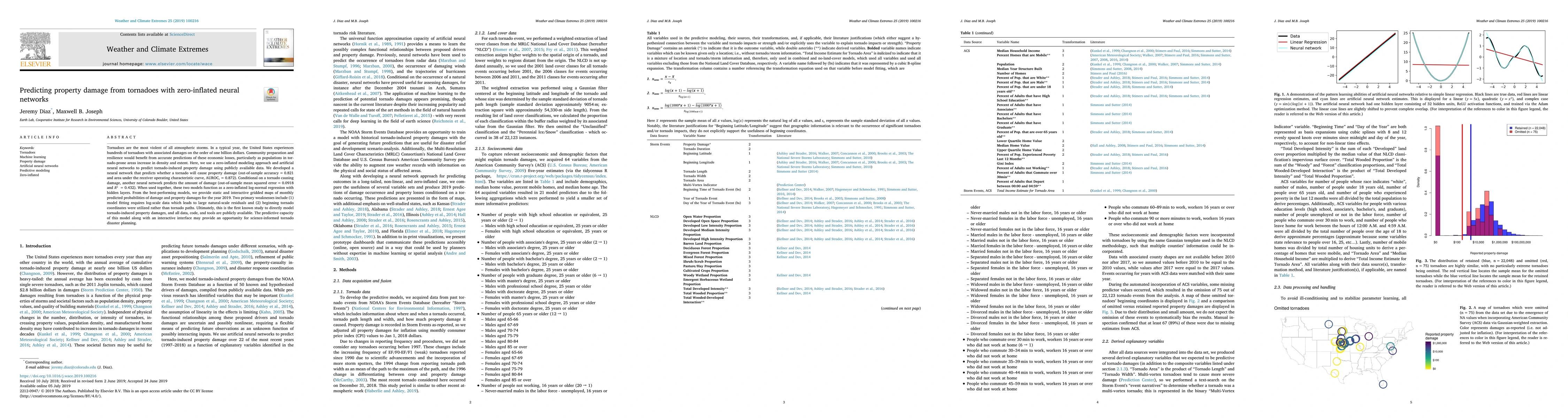 This study employs zero-inflated neural networks to predict tornado-induced property damage using publicly available data, achieving high accuracy in damage prediction. The model provides maps and interactive tools for forecasting damage probabilities and amounts, though it has limitations in data scaling and tornado path usage.