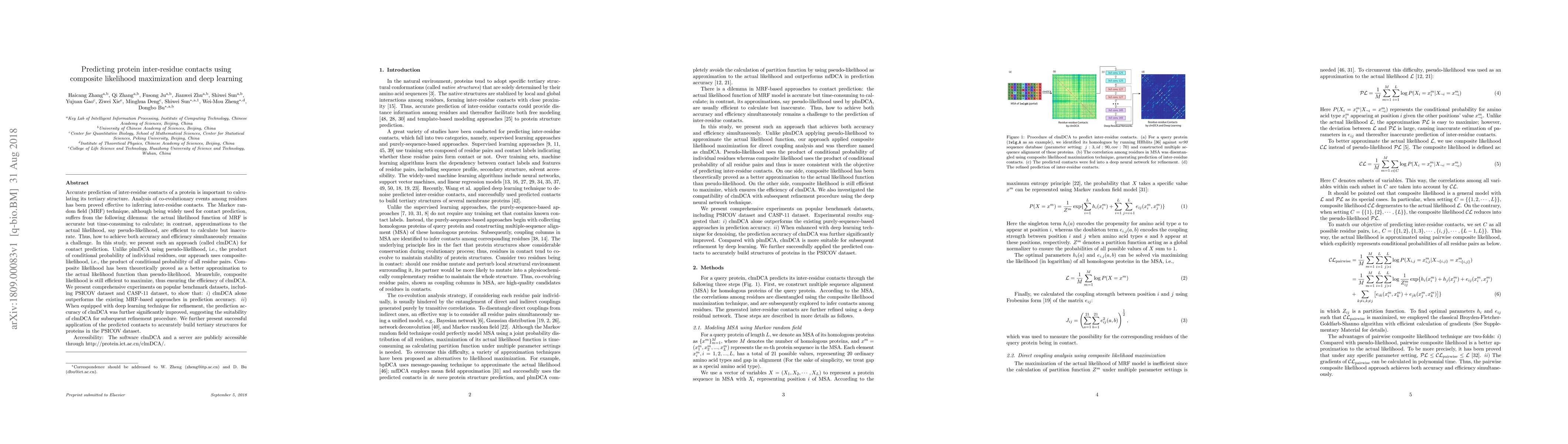 This paper proposes clmDCA, a method for predicting protein inter-residue contacts using composite likelihood maximization and deep learning, which outperforms existing MRF-based approaches in accuracy. The composite likelihood approach provides a better approximation to the actual likelihood function than pseudo-likelihood, ensuring both accuracy and efficiency.