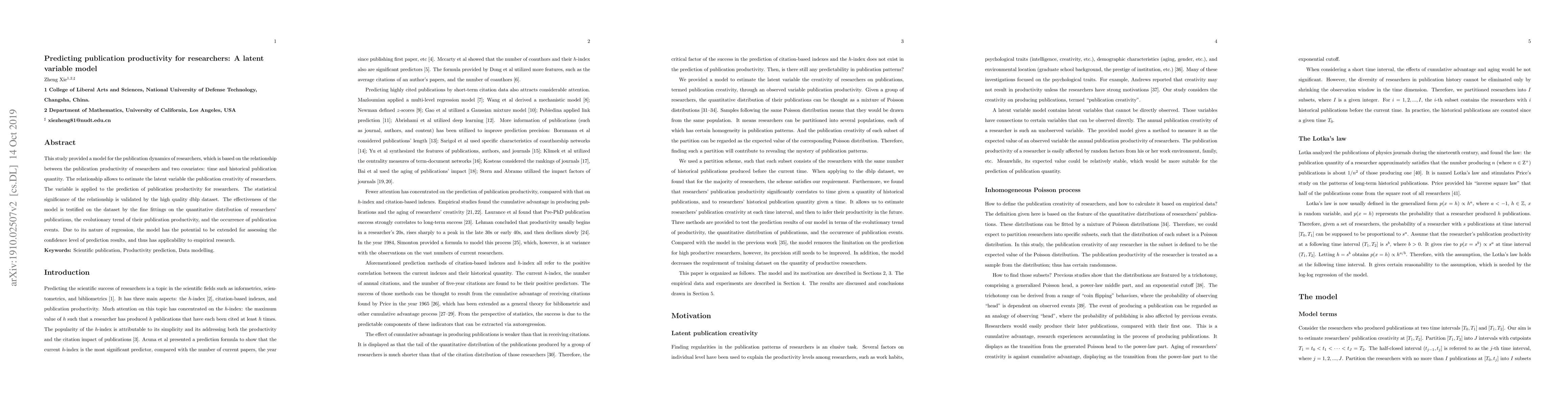 This study develops a latent variable model to predict researchers' publication productivity based on time and historical publication quantity, estimating researchers' publication creativity. The model's effectiveness is validated using the dblp dataset, showing accurate predictions and potential for assessing prediction confidence levels.
