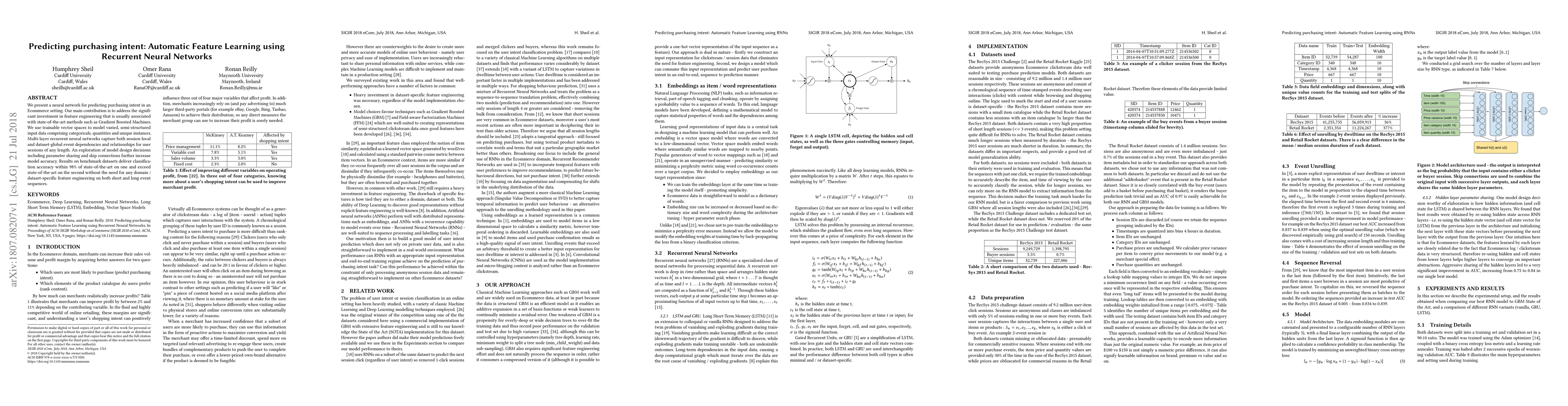 A neural network predicts purchasing intent with high accuracy without manual feature engineering, using trainable vector spaces and recurrent neural networks to capture session-local and dataset-global dependencies.